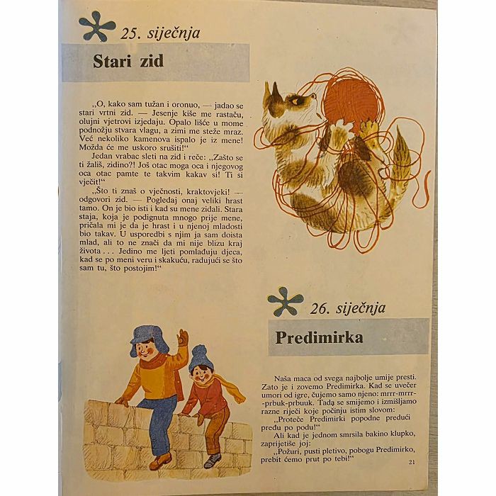 Stari zid ,,O, kako sam tužan i oronuo, jadao se stari vrtni zid. Jesenje kiše me rastaču, olujni vjetrovi izjedaju. Opalo lišće u mome podnožju stvara vlagu, a zimi me steže mraz. Već nekoliko kamenova ispalo je iz mene! Možda će me uskoro srušiti!" Jedan vrabac sleti na zid i reče: „Zašto se ti žališ, zidino?! Još otac moga oca i njegovog oca otac pamte te takvim kakav si! Ti si vječit!" „Što ti znaš o vječnosti, kraktovjeki! odgovori zid. Pogledaj onaj veliki hrast tamo. On je bio isti i kad su mene zidali. Stara staja, koja je podignuta mnogo prije mene, pričala mi je da je hrast i u njenoj mladosti bio takav. U usporedbi s njim ja sam doista mlad, ali to ne znači da mi nije blizu kraj života.. Jedino me ljeti pomlađuju djeca, kad se po meni veru i skakuću, radujući se što sam tu, što postojim!"