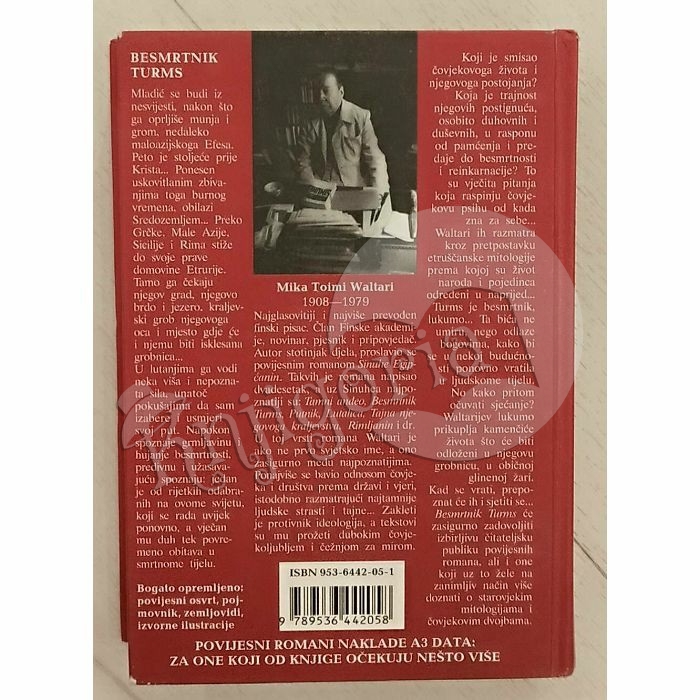 U petom stoljeću prije Krista, nedaleko od maloazijskog Efesa, jedan mladić budi se iz nesvijesti nakon što su ga ošamutili munja i grom, otputi se Sredozemljem do svoje prave domovine Etrurije, gdje ga čekaju njegov grad, brdo i jezero, kraljevski grob njegova oca. U tim lutanjima vodi ga neka viša i nepoznata sila, a naposljetku dolazi i do zapanjujuće spoznaje... Besmrtnik Turms će zasigurno zadovoljiti izbirljivu čitateljsku publiku povijesnih romana, ali i one koji žele na zanimljiv način više doznati o starovjekim mitologijama i čovjekovim dvojbama.