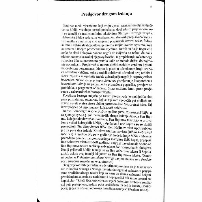 Predgovor drugom izdanju Kod nas među vjernicima koji svoju vjeru i praksu temelje isključi-vo na Bibliji, već dugo postoji potreba za dosljednim prijevodom ko-ji se temelji na tradicionalnim tekstovima Staroga i Novoga zavjeta. Hebrejska Biblija sačuvana je zalaganjem drevnih prepisivača koji su iz naraštaja u naraštaj vrlo savjesno prepisivali izvorni tekst. Židovi su imali veliko strahopoštovanje prema svojim svetim spisima, koje su smatrali Božjim proročanskim riječima. Držali su da je Bogu više stalo do slova i slogova Zakona negoli do zvijezda na nebu i da nauk (doktrina) ovisi o svakoj njegovoj kvačici. U prepisivanju ovlaštenoga rukopisa bila su nametnuta pravila kojih se trebalo držati do najma-nje potankosti. Prepisivač se morao služiti osobitim crnilom i pisati na osobitom pergamentu. Morao je pisati u određenom broju stupa-ca određene veličine, koji su smjeli sadržavati određeni broj redaka i slova. Nijedna se riječ nije smjela upisati prije negoli je se provjerilo u izvorniku. Nakon što je prijepis bio gotov, provjeren je i uspoređen s izvornikom. Ako je na pergamentu pronađena pogreška, provjera se prekidala, a pergament odbacivao. Stoga možemo imati puno povje-renje u sačuvani tekst Staroga zavjeta. Početkom šestoga stoljeća po Kristu prepisivače je naslijedila sku-pina poznata kao mazoreti, koji su tijekom sljedećih pet stoljeća na-stavili čuvati svete spise u obliku poznatom kao Mazoretski tekst. Taj izraz potječe od riječi mazor, koja znači uobičajen. Daniel Bomberg tiskao je 1516-17. godine prvu Rabinsku Bibliju, a za njom je 1524-25. godine uslijedilo drugo izdanje Jakoba Ben Haji-ma, koje je također izdao Bomberg. Ben Hajimov tekst bio je prihva-ćen u većini hebrejskih Biblija, uključujući i one kojima su se služili prevoditelji The King James Bible. Ben Hajimov tekst upotrijebljen je i za prva dva izdanja Kittelova Staroga zavjeta (Biblia Hebraica) 1906. i 1912. godine. No 1937. godine je treće izdanje Biblie Hebraice prerađeno pomoću Lenjingradskoga rukopisa (MS B19a), prijepisa Ben Asherova teksta iz 1008. godine, i u njoj je navedeno da se ono od Ben Hajimova teksta razlikuje u dvadeset do trideset tisuća slučajeva. Noviji prijevodi Biblije temelje se na Ben Asherovu tekstu (i Septua-ginti), dok se ovaj temelji isključivo na Ben Hajimovu tekstu. (Osnov-ni podaci o Prihvaćenom tekstu Novoga zavjeta nalaze se u Predgo-voru Novome zavjetu, na 954. stranici.) Ovaj prijevod Biblije rađen je s čvrstim uvjerenjem da je tekst izvor-nih rukopisa Staroga i Novoga zavjeta (autografa) sačuvan u prijepi-sima tradicionalnoga teksta koji su nam do danas sačuvani Božjim proviđenjem, a ne da su nadahnuti i nepogrešivi bili samo izvorni ru-kopisi. Jer: "Riječi GOSPODINOVE su riječi čiste; kao srebro u zemlja-noj peći pretopljeno, sedam puta pročišćeno. Ti ćeš ih čuvati, GOSPO-DINE; ti ćeš ih očuvati od ovoga naraštaja zauvijek" (Psalam 12,6.7).