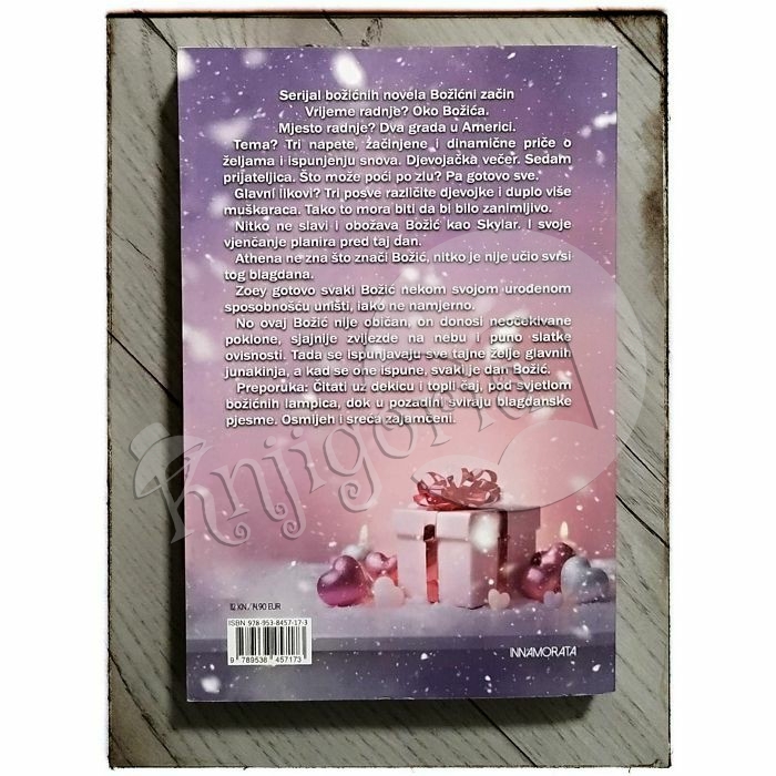 Serijal božićnih novela Božićni začin Vrijeme radnje? Oko Božića. Mjesto radnje? Dva grada u Americi. Tema? Tri napete, začinjene i dinamične priče o željama i ispunjenju snova. Djevojačka večer. Sedam prijateljica. Što može poći po zlu? Pa gotovo sve. Glavni likovi? Tri posve različite djevojke i duplo više muškaraca. Tako to mora biti da bi bilo zanimljivo. Nitko ne slavi i obožava Božić kao Skylar. I svoje vjenčanje planira pred taj dan. Athena ne zna što znači Božić, nitko je nije učio svrsi tog blagdana. Zoey gotovo svaki Božić nekom svojom urođenom sposobnošću uništi, iako ne namjerno. No ovaj Božić nije običan, on donosi neočekivane poklone, sjajnije zvijezde na nebu i puno slatke ovisnosti. Tada se ispunjavaju sve tajne želje glavnih junakinja, a kad se one ispune, svaki je dan Božić.