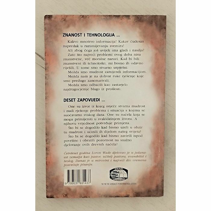 ZNANOST I TEHNOLOGIJA ... Kakvo mnoštvo informacija! Kakav čudesan napredak u razumijevanju svemira! Ali zbog čega još uvijek ima gladi i nasilja? Zato što najveći problemi ovog doba nisu znanstvene, već moralne naravi. Kad bi bili znanstveni ili tehnološki, mi bismo ih odavno riješili. U tome smo stvarno uspješni. Možda smo mudrost zamijenili informacijom. Možda nam je na dohvat ruke rješenje koje smo predugo zanemarivali. Možda smo odbacili kao zastarjelo najdragocjenije blago iz prošlosti. DESET ZAPOVIJEDI ... One su izvor iz kojeg istječe stvarna mudrost i nudi rješenje problema i situacija s kojima se suočavamo svakog dana. One su načela koja se mogu primijeniti u svakidašnjem životu. A njihovu vrijednost potvrđuje primjena. Što bi se dogodilo kad bismo uzeli u obzir tu mudrost i učinili ih dijelom našeg svijeta? Što bi se dogodilo kad bismo zavirili ispod površine i obratili pozornost na snažno djelovanje ovih drevnih načela? Četrdeset godina Loron Wade djelovao je u jedana est zemalja kao pastor, učitelj pastora, evandelist i teolog. Danas je u mirovini i najveći dio vremena posvećuje pisanju.