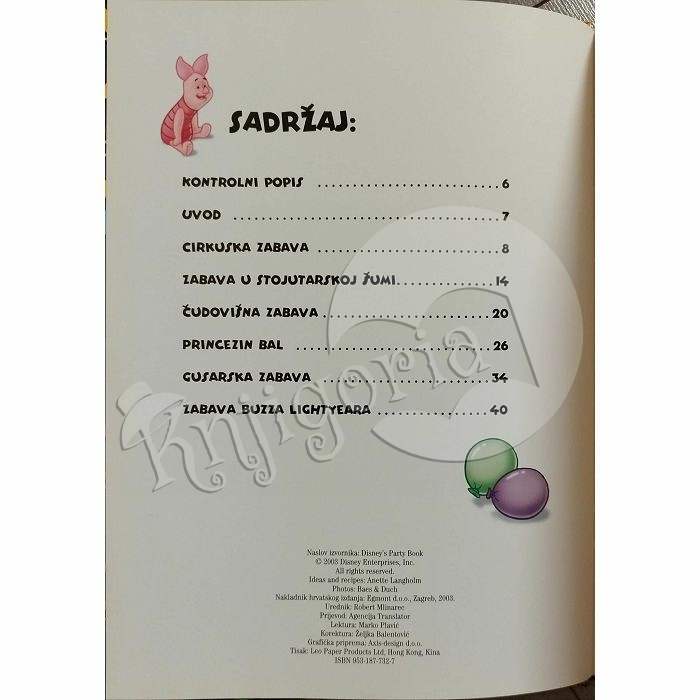 Upute za organiziranje tematskih zabava: cirkuska zabava, zabava u stojutarskoj šumi, čudovišna zabava, princezin bal, gusarska zabava, zabava svemirskog kauboja. Na početku su opće upute koje vrijede za svaku zabavu. Upute za tematske zabave obuhvaćaju izradu pozivnica, ukrašavanje stola i prostorije, jelovnik i recepte za predložena jela, te prigodne igre. Sa CD - ROM-a priloženog uz knjigu, mogu se otisnuti različiti potrebni sadržaji (sličice, pozivnice).