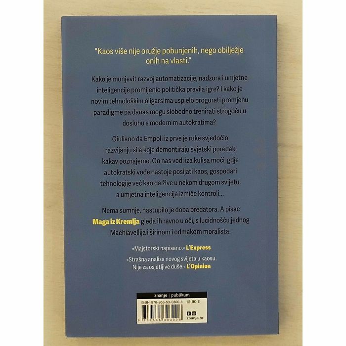 Giuliano da Empoli iz prve je ruke svjedočio razvijanju sila koje demontiraju svjetski poredak kakav poznajemo. On nas vodi iza kulisa moći, gdje autokratski vođe nastoje posijati kaos, gospodari tehnologije već kao da žive u nekom drugom svijetu, a umjetna inteligencija izmiče kontroli…