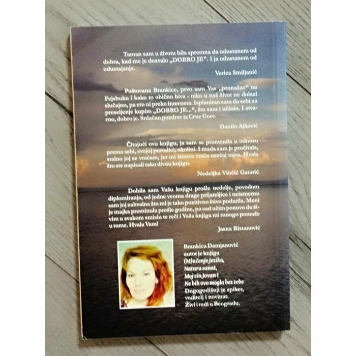 Taman sam u životu bila spremna da odustanem od dobra, kad me je dozvalo „DOBRO JE". I ja odustanem od odustajanja. Verica Smiljanić „Juče sam došao u posed sjajne knjige. Pun entuzijazma sam krenuo da je čitam i tek onda shvatio da nisu sva štiva ista. Poneka nas najvećom brzinom vuku od početka ka kraju. Ne ispuštamo ih iz ruku dok ne iščitamo i poslednju reč. Ovo je nešto sasvim drugačije. To nije priča, niti izmaglica u polju piščeve imaginacije. Ovo je ogromni kolaž satkan od bezbrojnih komadića sadašnjih trenutaka. Nema tu simulacije života, već same njegove srži. Priče ne opisuju šetnju pored obale mora i čežnjivi pogled na plivače u njemu, već govore o uranjanju celog autorovog bića u njegove vode. Svaka skica je simbol novog zaranjanja u vodu, novo krštenje, novo rađanje; ulazak u neki drugi život, opet isti a sasvim drugačiji; bogatiji za novu spoznaju koja nas daruje širim pogledom od jučerašnjeg. Veštim perom, nežno a veoma snažno, vodi nas autor putem svog razvića. Saznajemo, između ostalog, da čovek nije pusto i izolovano ostrvo i da su sva bića koja usput sretne njegovi učitelji. Zato ovo nije štivo za jedan dan niti storija o jednom čoveku. Priča je to o svima nama i putu kojim ćemo, ako već nismo, sigurno proći. Ovo je knjiga mudrosti koja izranja iz minulih vekova i magično spaja ono što je bilo sa onim što će biti. Ona ne postavlja pitanja niti daje odgovore, već budi kreatora u nama. Uvek je treba imati pri ruci i iznova joj se vraćati. Kad život pred nas postavi dilemu, uzmimo je u ruke, nasumično otvorimo i siguran sam da će ono što pročitamo da nam pokaže put.“