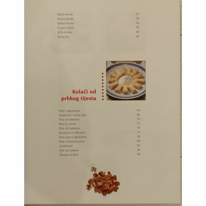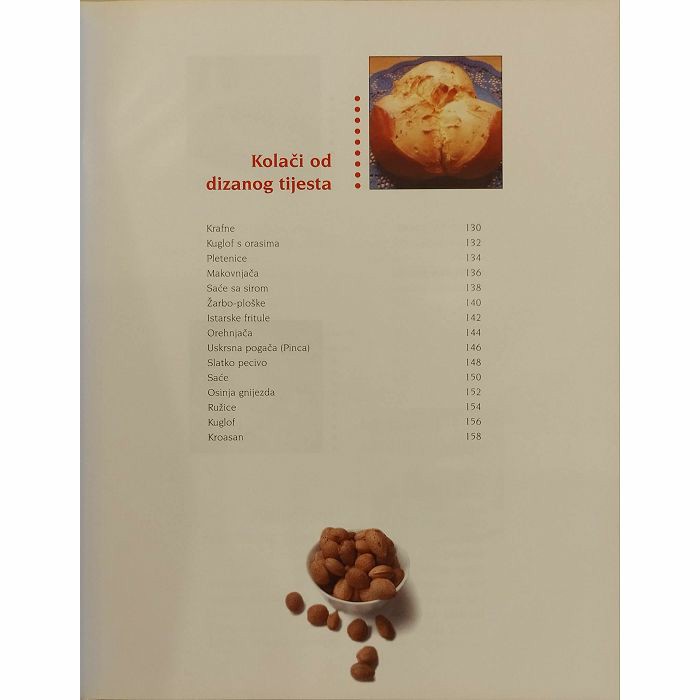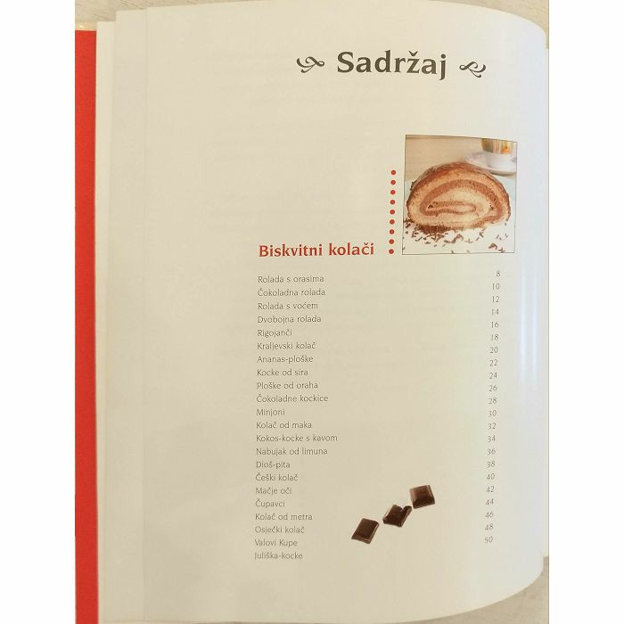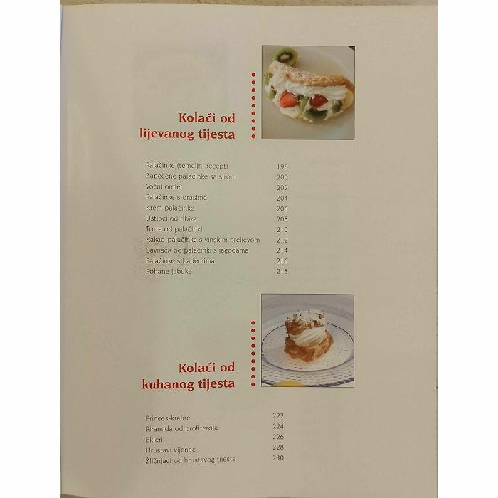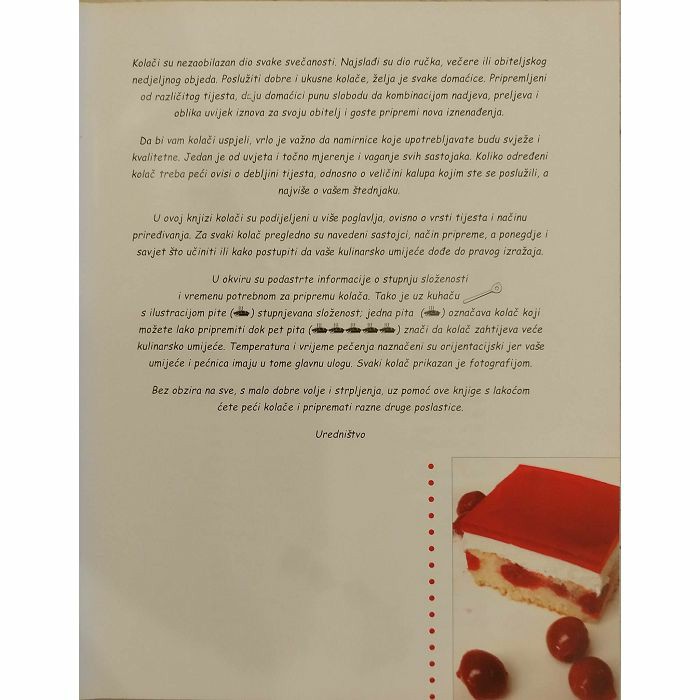 U ovoj knjizi kolači su podijeljeni u više poglavlja, ovisno o vrsti tijesta i načinu priređivanja. Za svaki kolač pregledno su navedeni sastojci, način pripreme, a ponegdje i savjet što učiniti ili kako postupiti da vaše kulinarsko umijeće dođe do pravog izražaja.