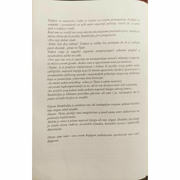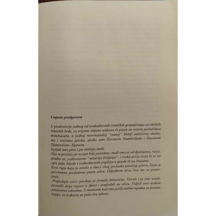 Umjesto predgovora U predvečerje jednog od svakodnevnih četničkih granatiranja sa okolnih bihaćkih brda, za vrijeme smjene tenkista ili pauze za večeru poslužilaca minobacača, u jednoj novonastaloj "ratnoj" birtiji zaštićenoj daska-ma i vrečama pjeska, sjedio sam Goranom Stambolijom i Hasanom Tijanovićem-Tijanom. Ispijali smo pivo i po običaju šutili. Nije se pričalo jer to nije bilo potrebno; znali smo se od djetinjstva, rat je, gladno se; jednostavno "mizerija življenja". ", i svaka priča svela bi se na opis jada, bijede i svakodnevnih pogibija u gradu ili na linijama. Kroz rupu koja je ostala u dasci zbog prolaska povećeg gelera Tijan je povremeno posmatrao pustu ulicu. Odjednom izraz lica mu se promi-jenio. -Pogledajte ovo!- povikao je pomalo histerično. Goran i ja smo ustali, pronašli dvije rupice u dasci i pogledali na ulicu. Vidjeli smo traktor pretovaren tabutima. U momentu kad smo prišli našim rupama za posma-tranje, sa traktora su pala dva tabuta.