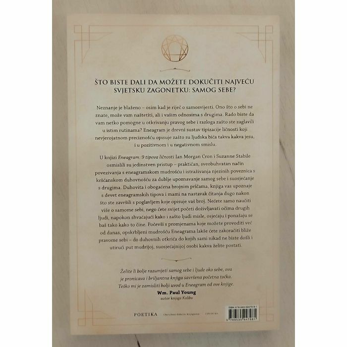 U knjizi Eneagram: 9 tipova ličnosti Ian Morgan Cron i Suzanne Stabile osmislili su jedinstven pristup – praktičan, sveobuhvatan način povezivanja s eneagramskom mudrošću i istraživanja njezinih poveznica s kršćanskom duhovnošću za dublje upoznavanje samog sebe i suosjećanje s drugima. Duhovita i obogaćena brojnim pričama, knjiga vas upoznaje s devet eneagramskih tipova i mami na nastavak čitanja dugo nakon što ste završili s poglavljem koje opisuje vaš broj. Nećete samo naučiti više o samome sebi, nego ćete svijet početi doživljavati očima drugih ljudi, napokon shvaćajući kako i zašto ljudi misle, osjećaju i ponašaju se baš tako kako to čine. Počevši s promjenama koje možete provoditi već od danas, opskrbljeni mudrošću Eneagrama lakše ćete zakoračiti bliže pravome sebi – do duhovnih otkrića do kojih sami nikad ne biste došli i utirući put mudrijoj, suosjećajnijoj osobi kakva želite postati.