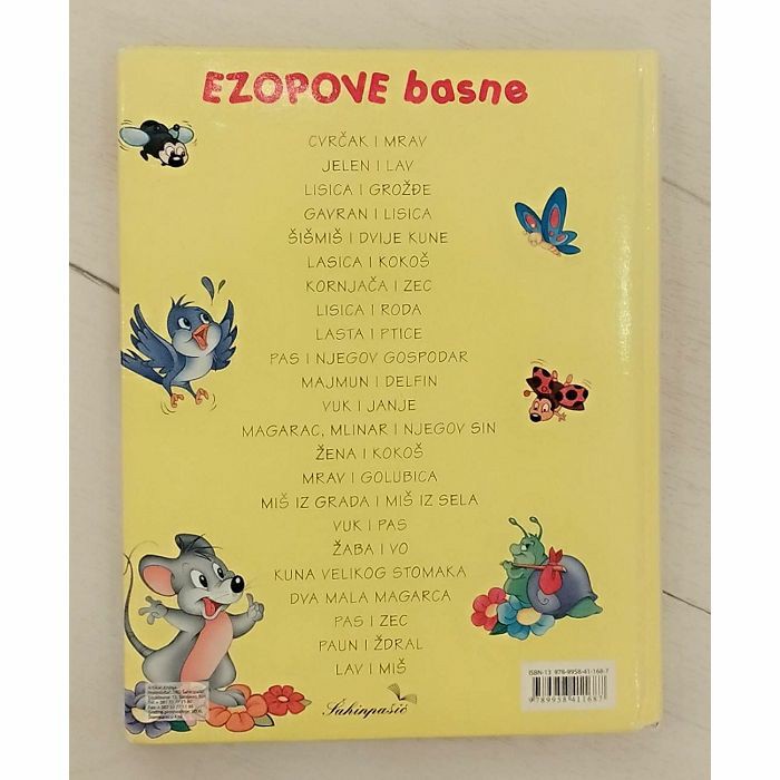 CVRČAK I MRAV JELEN I LAV LISICA I GROŽĐE GAVRAN I LISICA ŠIŠMIŠ I DVIJE KUNE LASICA I KOKOŠ KORNJAČA I ZEC LISICA I RODA LASTA I PTICE PAS I NJEGOV GOSPODAR MAJMUN I DELFIN VUK I JANJE MAGARAC, MLINAR I NJEGOV SIN ŽENA I KOKOŠ MRAV I GOLUBICA MIŠ IZ GRADA I MIŠ IZ SELA VUK I PAS ŽABA I VO KUNA VELIKOG STOMAKA DVA MALA MAGARCA PAS I ZEC PAUN I ŽDRAL LAV I MIŠ
