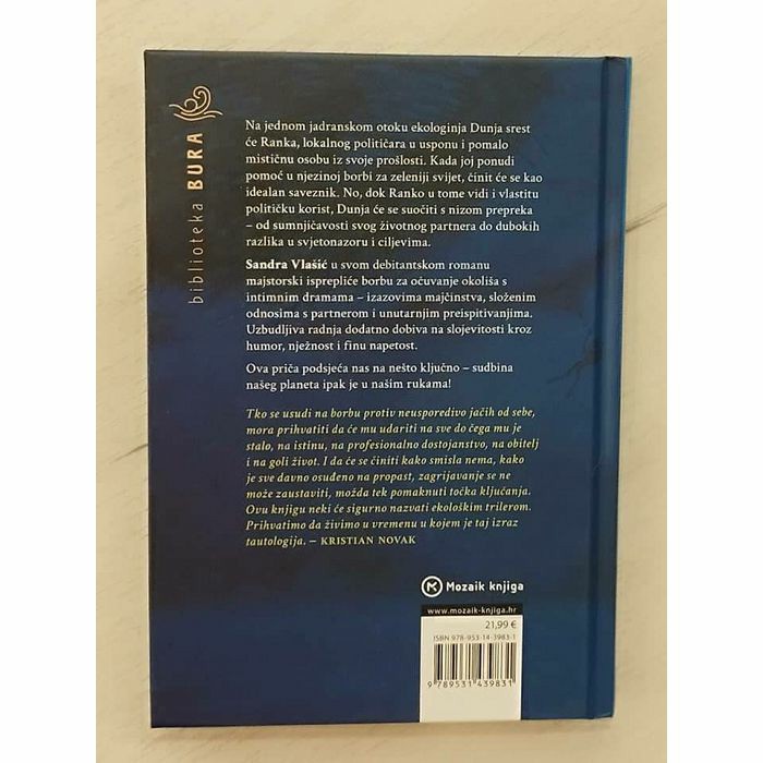 Ovo nije samo knjiga – ovo je odraz naše stvarnosti. Jer borba za planet nije priča budućnosti. Ona se događa sada. Ekologinja Dunja godinama se bori protiv eksploatacije nafte u Hrvatskoj, a neočekivani susret s Rankom na jednom jadranskom otoku daje joj novi vjetar u leđa. Ovaj pomalo misteriozan poznanik iz Dunjine prošlosti danas je ambiciozan političar – a sada ih povezuje nešto mnogo veće. No može li mu vjerovati? Može li balansirati između obitelji, uvjerenja, majčinstva i surove stvarnosti u kojoj su interesi jači od savjesti? U romanu se isprepliću slike Dunjinih životnih i profesionalnih uspjeha, neuspjeha i promjena, od studentskih dana do zrelosti. U podlozi priče i klimatskih slika su znanstvene činjenice i mogući scenariji za našu budućnost, a radnja je inspirirana nekim stvarnim događajima iz naše neposredne prošlosti.