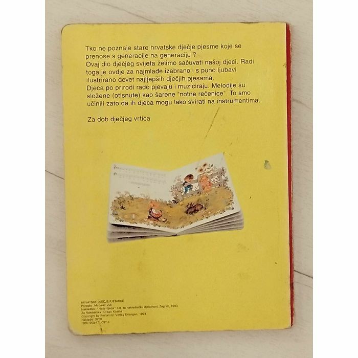Tko ne poznaje stare hrvatske dječje pjesme koje se prenose s generacije na generaciju? Ovaj dio dječjeg svijeta želimo sačuvati našoj djeci. Radi toga je ovdje za najmlade izabrano i s puno ljubavi ilustrirano devet najljepših dječjih pjesama. Djeca po prirodi rado pjevaju i muziciraju. Melodije su složene (otisnute) kao šarene "notne rečenice". To smo učinili zato da ih djeca mogu lako svirati na instrumentima. Za dob dječjeg vrtića