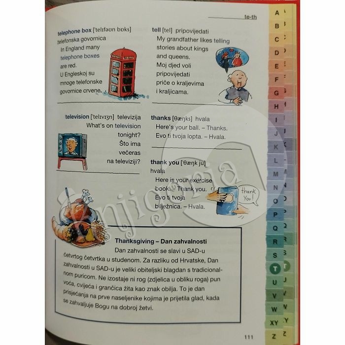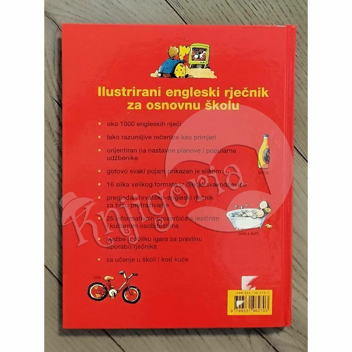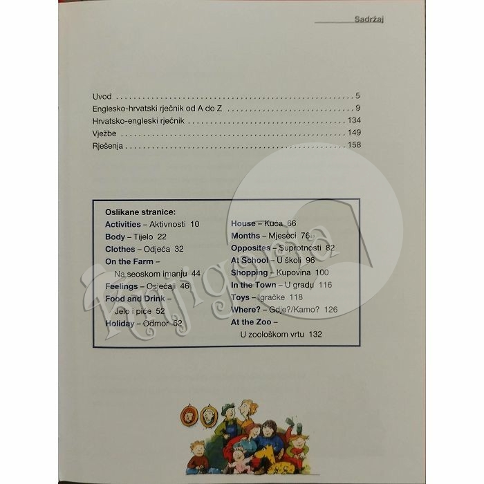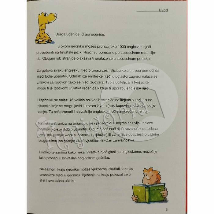 Sadrži i 16 slika velikog formata iz dječje svakodnevice, pregledan hrvatsko-engleski rječnik za brzo pretraživanje, 25 informativnih prozorčića s jezičnim i kulturnim osobitostima te vježbe u obliku igara za pravilnu uporabu rječnika. Idealan je za učenje engleskog u školi i kod kuće.