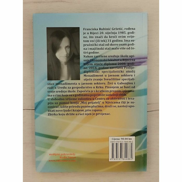 Franciska Rubinić Gržetić, rođena je u Rijeci 20. siječnja 1985. godi-ne, što znači da kroči ovim svije-tom već (ili tek) 31 godinu. Ima su-pružnički staž od skoro osam godi-na i majčinski staž malo više od če-tiri godine. Nakon završene srednje škole upi-suje Ekonomski fakultet u Rijeci na kojem stječe diplomu 2008. godi-ne. 2014. godine završava Poslije-diplomski specijalistički studij Menadžment u javnom sektoru i stječe zvanje Sveučilišne specijali-stice menadžmenta u javnom sektoru. Živi u Gabonjinu i radi u Uredu za gospodarstvo u Krku. Pisanjem se bavi od svoje srednje škole. Započela je s kratkom prozom i pjesma-ma u rimi koje su s godinama poprimile sadašnji oblik. U slobodno vrijeme volontira u Centru za aktivnosti i tera-piju uz pomoć konja „Moj prijatelj" u Njivicama čiji je su-osnivač, udiše prirodu punim plućima, druži se, nastoji upo-znati nove ljude i krajeve, piše i spava. Zbirka koju držite u ruci njen je prvijenac.