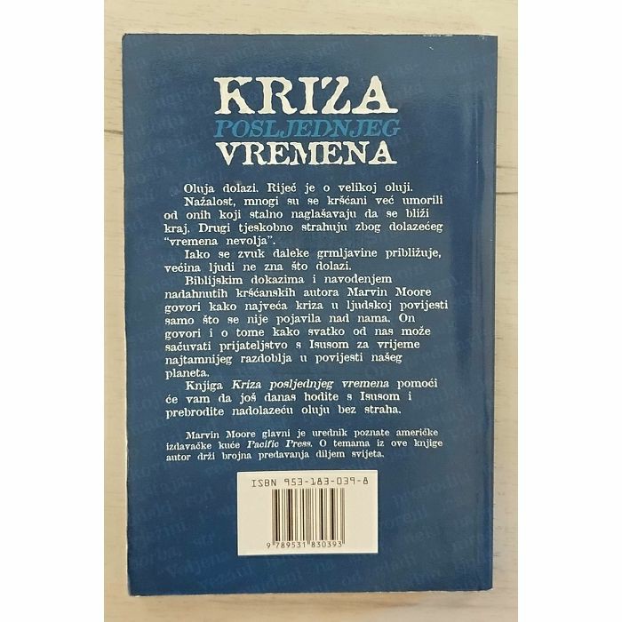 Oluja dolazi. Riječ je o velikoj oluji. Nažalost, mnogi su se kršćani već umorili od onih koji stalno naglašavaju da se bliži kraj. Drugi tjeskobno strahuju zbog dolazećeg “vremena nevolja”. Iako se zvuk daleke grmljavine približio, većina ljudi ne zna što dolazi. Biblijskim dokazima i navođenjem nadahnutih kršćanskih autora Marvin Moore govori kako najveća kriza u ljudskoj povijesti samo što se nije pojavila nad nama. On govori i o tome kako svatko od nas može sačuvati prijateljstvo s Isusom za vrijeme najtamnijeg razdoblja u povijesti našeg planeta. Knjiga “Kriza posljednjeg vremena” pomoći će vam da još danas hodite s Isusom i prebrodite nadolazeću oluju bez straha.