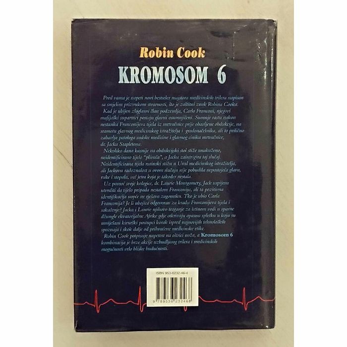 Pred vama je napeti novi bestseler majstora medicinskih trilera napisan sa smjelim prizvukom stvarnosti, što je zaštitni znak Robina Cooka. Kad je ubijen zloglasni član podzemlja, Carlo Franconi, njegovi majijaški suparnici postaju glavni osumnjičeni. Sumnje rastu nakon nestanka Franconijeva tijela iz mrtvačnice prije obavljene obdukcije, na sramotu glavnog medicinskog istražitelja i gradonačelnika, ali to prilično zabavlja patologa sudske medicine i glavnog cinika mrtvačnice, dr.Jacka Stapletona. Nekoliko dana kasnije na obdukcijski stol stiže unakaženo, i neidentificirano tijelo "plivača", a Jacka zaintrigira taj slučaj. Neidentificirana tijela rutinski stižu u Ured medicinskog istražitelja, ali Jackovu radoznalost u ovom slučaju nije pobudila nepostojeća glava, ruke i stopala, već jetra koja je također nestala. Uz pomoć svoje kolegice, dr. Laurie Montgometj, Jack uspijeva utvrditi da tijelo pripada nestalom Franconiju, ali ta pozitivna identifikacija uopće ne rješava zagonetku. Tko je ubio Carla Franconija?Je li ubojica odgovoran za krađu Franconijeva tijela i sakaćenje? Jacka i Laurie njihovo traganje za istinom vodi u sparne džungle ekvatorijalne Afrike gdje otkrivaju opasnu spletku u koju su umiješani kirurški postupci korak ispred najnovijih tehnoloških spoznaja i skok dalje od prihvaćene medicinske etike. Robin Cook potpisuje napetost na oštrici noža, a Kromosom 6 kombinacija je brze akcije uzbudljivog trilera i medicinskih mogućnosti vrlo bliske budućnosti.
