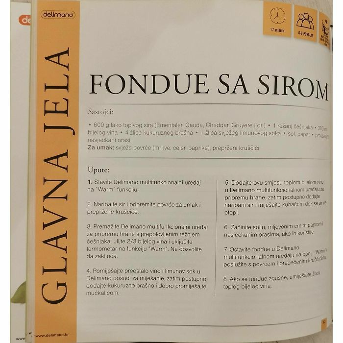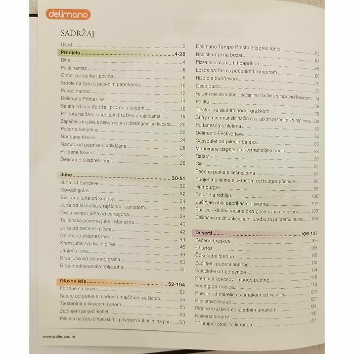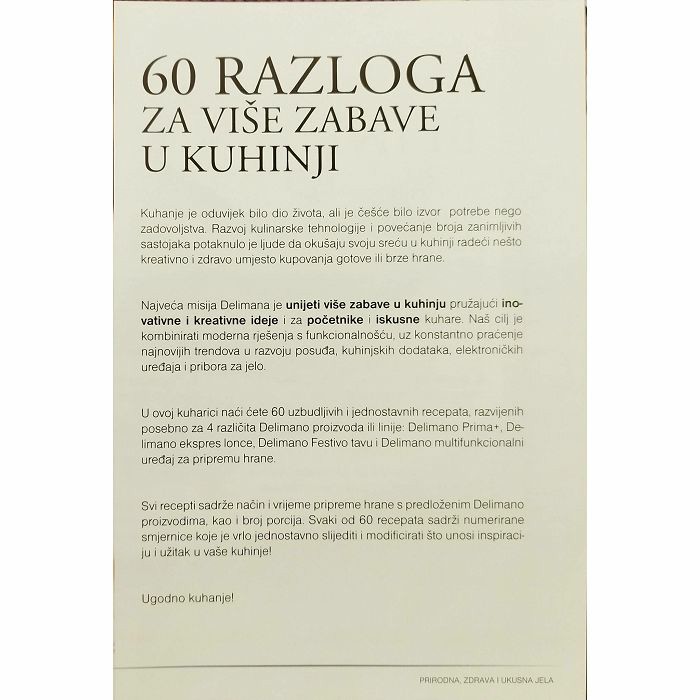 60 RAZLOGA ZA VIŠE ZABAVE U KUHINJI Kuhanje je oduvijek bilo dio života, ali je češće bilo izvor potrebe nego zadovoljstva. Razvoj kulinarske tehnologije i povećanje broja zanimljivih sastojaka potaknulo je ljude da okušaju svoju sreću u kuhinji radeći nešto kreativno i zdravo umjesto kupovanja gotove ili brze hrane. Najveća misija Delimana je unijeti više zabave u kuhinju pružajući ino-vativne i kreativne ideje i za početnike i iskusne kuhare. Naš cilj je kombinirati moderna rješenja s funkcionalnošću, uz konstantno praćenje najnovijih trendova u razvoju posuđa, kuhinjskih dodataka, elektroničkih uređaja i pribora za jelo. U ovoj kuharici naći ćete 60 uzbudljivih i jednostavnih recepata, razvijenih posebno za 4 različita Delimano proizvoda ili linije: Delimano Prima+, De-limano ekspres lonce, Delimano Festivo tavu i Delimano multifunkcionalni uređaj za pripremu hrane. Svi recepti sadrže način i vrijeme pripreme hrane s predloženim Delimano proizvodima, kao i broj porcija. Svaki od 60 recepata sadrži numerirane smjernice koje je vrlo jednostavno slijediti i modificirati što unosi inspiraci-ju i užitak u vaše kuhinje! Ugodno kuhanje!