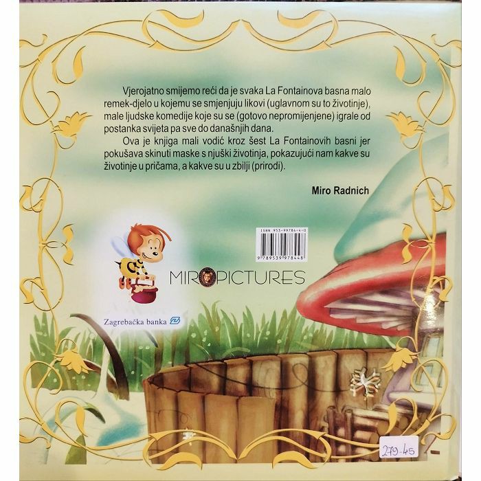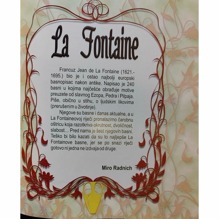 Vjerojatno smijemo reći da je svaka La Fontainova basna malo remek-djelo u kojemu se smjenjuju likovi (uglavnom su to životinje), male ljudske komedije koje su se (gotovo nepromijenjene) igrale od postanka svijeta pa sve do današnjih dana. Ova je knjiga mali vodić kroz šest La Fontainovih basni jer pokušava skinuti maske s njuški životinja, pokazujući nam kakve su životinje u pričama, a kakve su u zbilji (prirodi).
