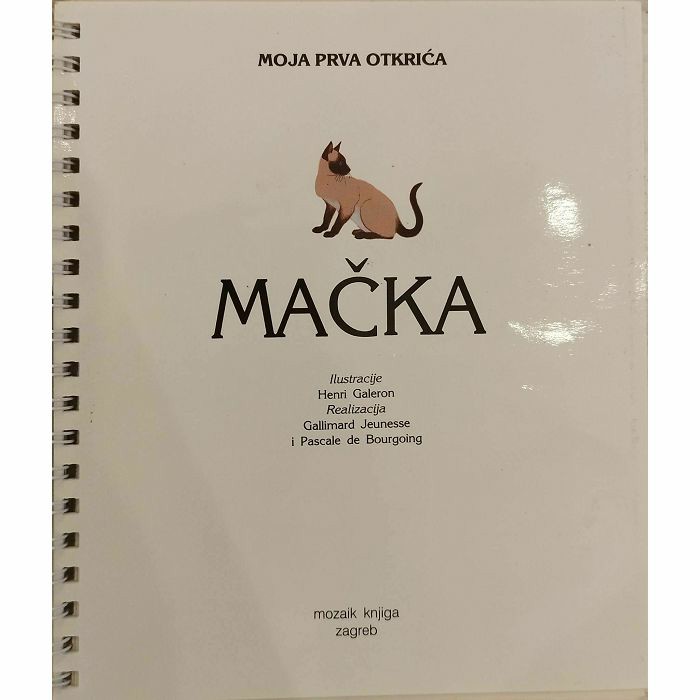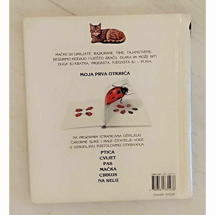 Moja prva otkrića: Mačke Henri Galeron MAČKE SU UMILJATE, RAZIGRANE, TIHE, TAJANSTVENE...BEŠUMNO HODAJU I VJEŠTO SKAČU. DLAKA IM MOŽE BITI DUGA ILI KRATKA, PRUGASTA, PJEGASTA ILI - PLAVA.NA PROZIRNIM STRANICAMA OŽIVLJUJU ČAROBNE SLIKE I MALE ČITATELJE VODE U UZBUDLJIVU PUSTOLOVINU OTKRIVANJA.