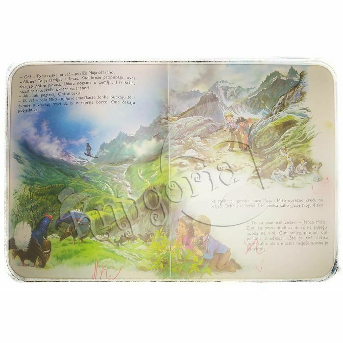 Maja i Mišo u planini Gilbert Delahaye, Marcel Marlier Želja za upoznavanjem prirode odvela je Maju i Mišu iz polja u šumu, iz šume na rijeku.Ovdje ih nalazimo na visokoj planini.NAPOMENA: šarano flomasterom po listovima, vidi slike