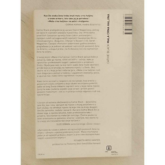 U svojoj knjizi Mala crna haljina Cathie Black opisuje kako je ostvarila, kako ga naziva, život od 360° točnije, kako je >>pomirila profesionalni uspjeh i zadovoljstvo u privatnom životu. Objašnjava nam na koji način svaka žena može iskoristiti prilike koje joj se pružaju na radnome mjestu i u životu. Bez obzira na to u kojoj je fazi naša karijera, Mala crna haljina nudi nam dragocjenu pomoć u traženju i uspješnom obavljanju posla, a upućuje nas i kako ćemo napredovati na poslu. Kako ćemo se snaći u razgovoru za novi posao, koja pravila u poslovnom svijetu smijemo a koja nikako ne smijemo prekršiti, zašto od svog života trebamo napraviti zonu u kojoj nema mjesta ljutnji te kako možemo slijediti svoje strasti i pritom postići poslovni maksimum-sve su to pitanja na koja odgovore nudi ova sjajna knjiga Ja sam strastvena obožavateljica Cathie Black djelomično zato što, kao i ona, vjerujem da mjesto iz kojeg potječete ni u kom slučaju ne odreduje mjesto na koje ćete na kraju dospjeti Sve što zamislite, možete i ostvariti. Karijera Cathie Black živi je dokaz toga, a njezina iskustva, kako profesionalna tako privatna, fascinantan su materijal za knjigu. Životne pouke na ovim stranicama su pametne, stvarne i uvjerljive, bez obzira na to u kojoj ste trenutačno fazi svoje karijere. SUZE ORMAN, autorica knjige Žene i novac Zamislite da ručate s jednom od najmoćnijih poslovnih žena na svijetu i uživajte u njezinoj prekrasnoj knjizi. Mala crna haljina jedan je od najboljih prikaza u kojem iz prve ruke doznajete kako uspjeti u poslovnom svijetu.