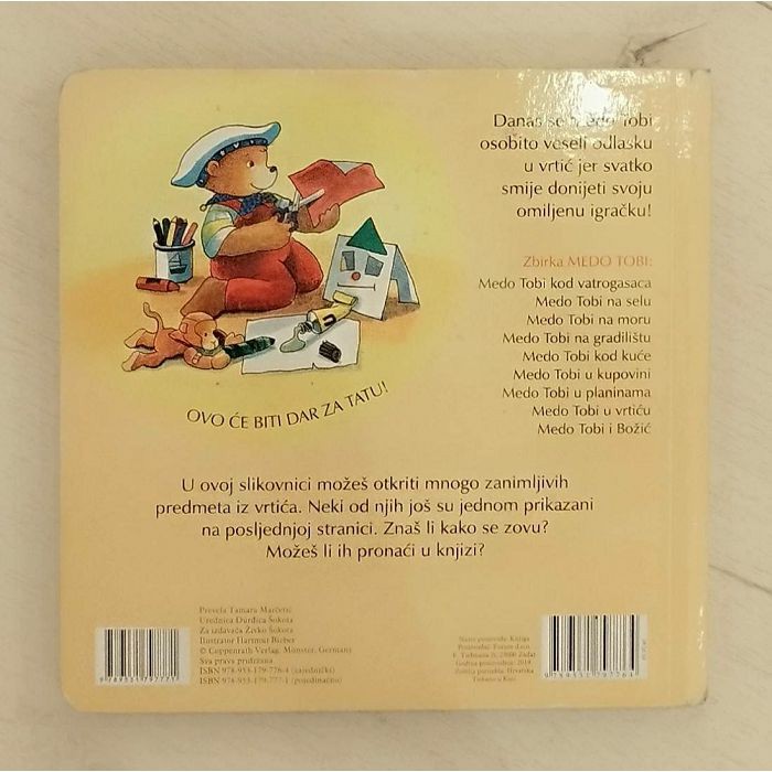 Danas se medo Tobi osobito veseli odlasku u vrtić, jer svatko smije donjeti svoju omiljenu igračku! U ovoj slikovnici možete otkriti mnogo zanimljivih predmeta iz vrtića. Neki od njih su još jednom prikazani na posljednjoj stranici. Znaš li kako se zovu? Možeš li ih pronaći u knjizi?