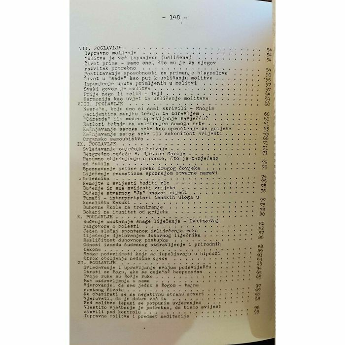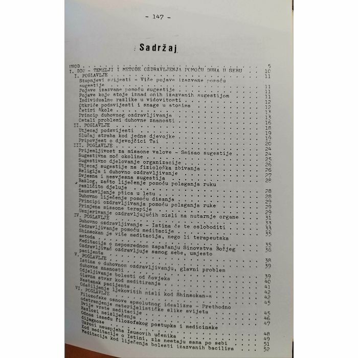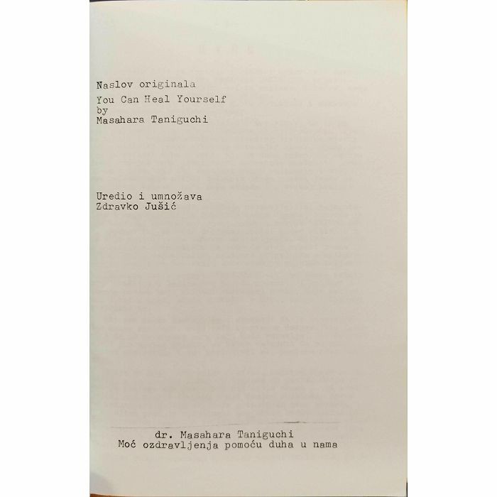 UVOD Ovo djelo koje je napisao osnivač i upravitelj suvre-nog duhovnog pokreta, Dr. MASAHARA TANIGUCHI, predsta-jalo je senzaciju za Japan, a i za engleske čitaoce, kada pojavilo američko izdanje ove knjige. Pisac u njoj na slijedeći način obrazlaže i dokazuje ako formuliranu uzvišenu istinu: Svaki čovjek je Dijete Božje i kao takav, on je po ojoj sklonosti i po svojoj unutarnjoj biti savršen. Nje-vo tijelo i vanjske okolnosti njegovog života su vjeran raz i vidljivi izraz njegovog nutarnjeg stava, prema to-on je refleks duha u sebi, tj. od duha rođen. Na osnovu čenog, čovjek može promijeniti spomenute okolnosti pomo-duha u sebi, tj. ako izmijeni svoju miäljenje i svoj av. Ozdravljenje pomoću duševnih snaga u sebi jeste po-e prirodan proces, koji može svatko i u svakoj prilici stići. Dr. Taniguchi, koga smatraju najaktivnijim, najznača-ijim i najutjecajnijim duhovnim vođom Japana, osnovao je ije trideset godina suvremeni duhovni pokret "SEICHO-NO-", osposobio i od tada izgradio brojni kadar učitelja i ih koji prakticiraju duhovno ozdravljenje. Njihovo uspje-o djelovanje pridonijelo je tome da ovaj pokret danas oji u Japanu već nekoliko milijuna pripadnika a njihova djela čitaju sa sve većim interesom po cijelom svijetu. Japanski naziv pokreta "SEICHO-NO-IE" po svome smislu ači "Utočište u Beskrajnom životu mudrosti i Punine" i rdi de čovjek koji slijedi suvremenu nauku, koja naučava avi život u duhu, ulazi u utočište mira, snage i Ljubavi preporada se. Bit ove nauke sastoji se u spoznaji da je Sinovstvo žje jedna realnost, koja važi za svakog čovjeka bez izni-e, i da je za svakog onog koji želi zdravlje, Savršenstvo život pun pravog smisla, od bitne važnosti da postane jestan ove istine i da, probudivši se, postane novi čo-ek. Ovdje se daje nova slika čovjeka, onakvog kakav je on stinu, a ne onakvog kakav on izgleda da jeste. Ovdje se kazuje čovjeka kao gospodara nad samim sobom i nad svojim jelom, nad svojim životom i nad svojom sudbinom. Prema me razumljivo je oduševljenje pripadnika ovog pokreta, rse njima pružaju mogućnosti uspješnog ozdravljenja po-ću duhovno-religioznih Istina krščanstva, budizma i osta-h religija u svakodnevnom životu, tako da se nadmoć Duha id tijelom i životom neposredno manifestira i u najtežim tuacijama u životu. Prema ovoj suvremenoj duhovnoj nauci, onako kako ju je.............