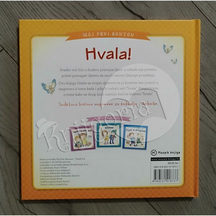 Svatko voli biti u društvu pristojne djece, a nikada nije prerano početi pomagati djetetu da nauči osnove lijepoga ponašanja. Knjižicu Moj prvi bonton – hvala! čitajte sa svojim mališanom te je rabite kao pomoć u razgovoru o tome kada bi i gdje trebalo reći “hvala”. Razgovarajte sa svojim djetetom i o tome kako se drugi ljudi osjećaju kada mi njima kažemo “hvala” te ga poučite o važnosti zahvaljivanja.