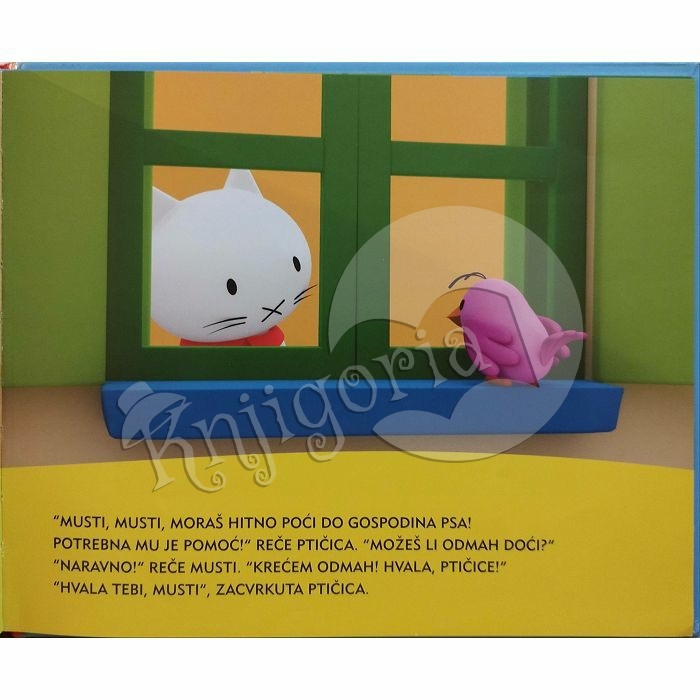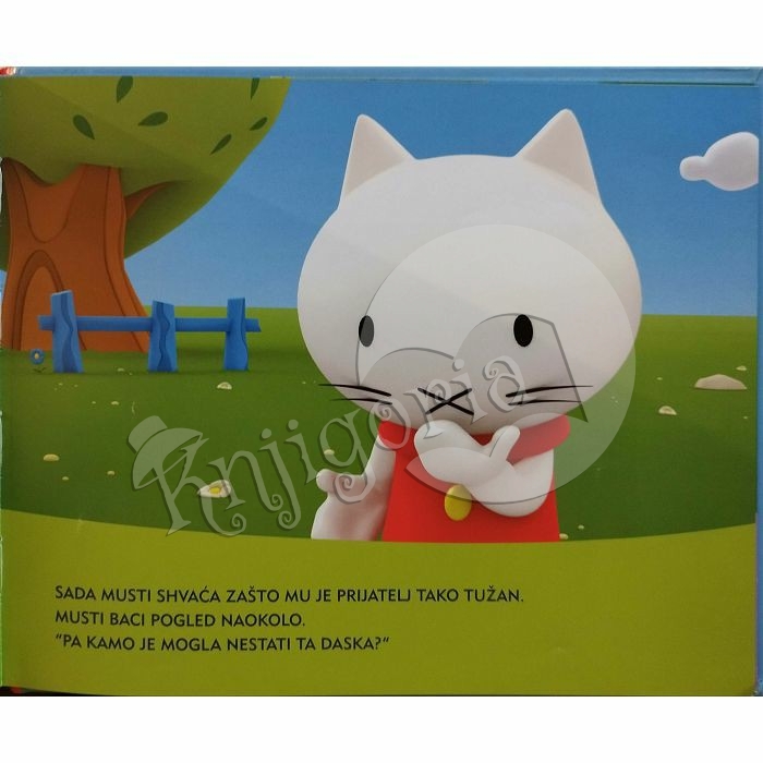 Zbirka Musti donosi nam šest slikovnica u kojima su glavni likovi simpatična mačja obitelj i njihovi prijatelji, nastali po istoimenoj popularnoj animiranoj seriji. Musti je glavni lik, mali mačić koji uglavnom pomaže prijateljima u nevolji. U ovoj epizodi, gospodin pas je jako tužan, jer mu je netko odnio dasku s krova njegove kućice. No tu je Musti, koji uvijek uspješno pomaže prijateljima i sve se sretno završava. Slikovnice su pisane velikim tiskanim slovima.