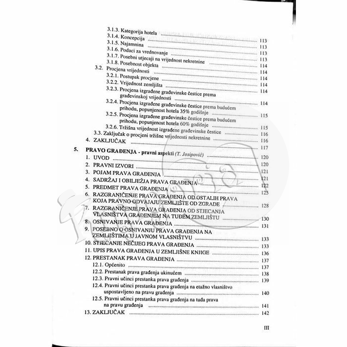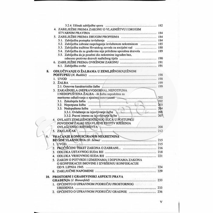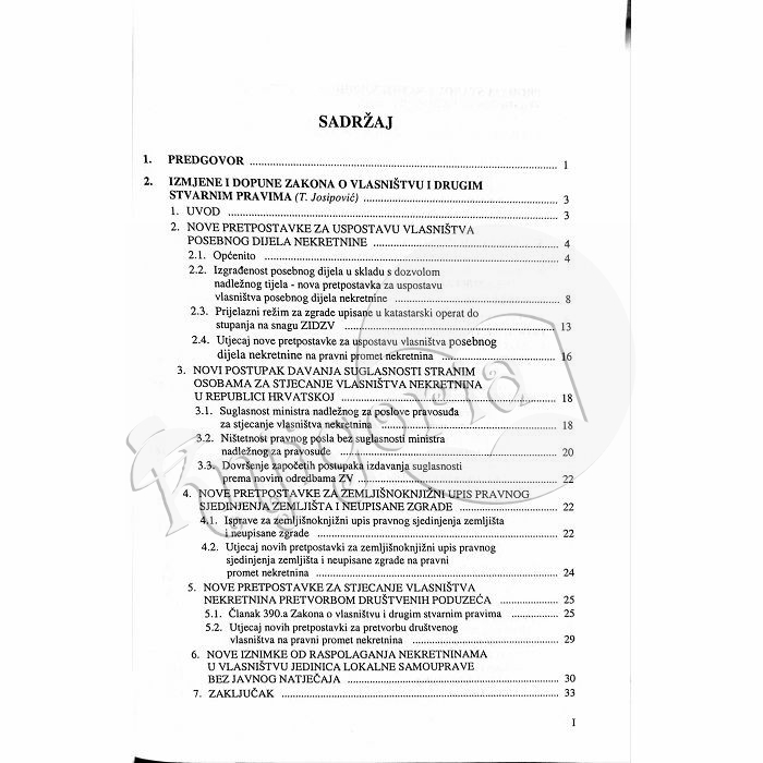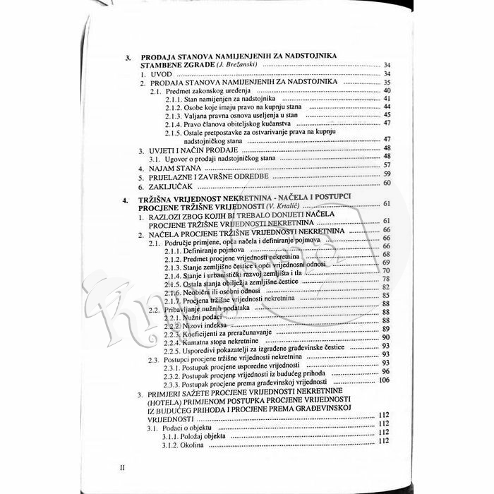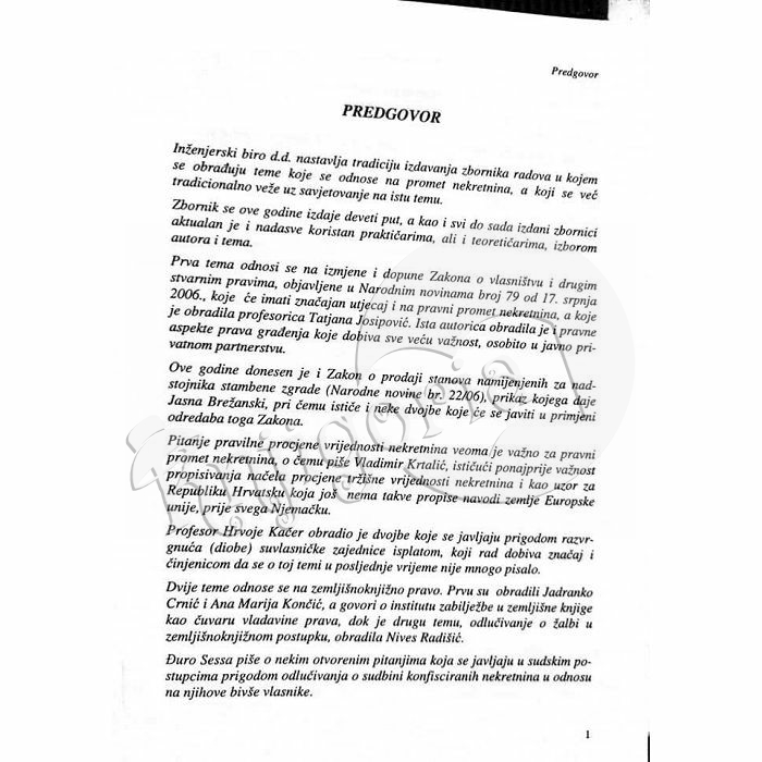 Inženjerski biro d.d. nastavlja tradiciju izdavanja zbornika radova u kojem se obrađuju teme koje se odnose na promet nekretnina, a koji se već tradicionalno veže uz savjetovanje na istu temu. Zbornik se ove godine izdaje deveti put, a kao i svi do sada izdani zbornici aktualan je i nadasve koristan praktičarima, ali i teoretičarima, izborom autora i tema. Prva tema odnosi se na izmjene i dopune Zakona o vlasništvu i drugim stvarnim pravima, objavljene u Narodnim novinama broj 79 od 17. srpnja 2006., koje će imati značajan utjecaj i na pravni promet nekretnina, a koje je obradila profesorica Tatjana Josipović. Ista autorica obradila je i pravne aspekte prava građenja koje dobiva sve veću važnost, osobito u javno pri-vatnom partnerstvu. Ove godine donesen je i Zakon o prodaji stanova namijenjenih za nad-stojnika stambene zgrade (Narodne novine br. 22/06), prikaz kojega daje Jasna Brežanski, pri čemu ističe i neke dvojbe koje će se javiti u primjeni odredaba toga Zakona. Pitanje pravilne procjene vrijednosti nekretnina veoma je važno za pravni promet nekretnina, o čemu piše Vladimir Krtalić, ističući ponajprije važnost propisivanja načela procjene tržišne vrijednosti nekretnina i kao uzor za Republiku Hrvatsku koja još nema takve propise navodi zemlje Europske unije, prije svega Njemačku. Profesor Hrvoje Kačer obradio je dvojbe koje se javljaju prigodom razvr-gnuća (diobe) suvlasničke zajednice isplatom, koji rad dobiva značaj i činjenicom da se o toj temi u posljednje vrijeme nije mnogo pisalo. Dvije teme odnose se na zemljišnoknjižno pravo. Prvu su obradili Jadranko Crnić i Ana Marija Končić, a govori o institutu zabilježbe u zemljišne knjige kao čuvaru vladavine prava, dok je drugu temu, odlučivanje o žalbi u zemljišnoknjižnom postupku, obradila Nives Radišić. Đuro Sessa piše o nekim otvorenim pitanjima koja se javljaju u sudskim po-stupcima prigodom odlučivanja o sudbini konfisciranih nekretnina u odnosu na njihove bivše vlasnike.