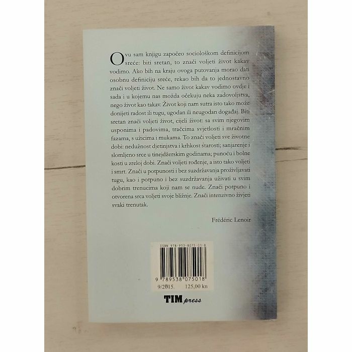 U izdanju TIM pressa objavljena je nova knjiga francuskoga autora Frédérica Lenoira O sreći. Filozofsko putovanje. Što znači sreća? Ovisi li o našim genima, o slučajnosti, ili pak o našoj senzibilnosti? Može li se stanje sreće očuvati ili se sastoji tek od prolaznih zadovoljstava? Je li sreća subjektivna? Trebamo li je tražiti i može li ona rasti? Mogu li patnja i sreća koegzistirati? Da bi odgovorio na ova pitanja, Frédéric Lenoir nudi ovo filozofsko putovanje. Ova knjiga je izazovna šetnja s velikim mudracima Istoka i Zapada, šetnja Epikurovim vrtovima užitka gdje odjekuju riječi Montaignea i Zhuang Zhua, gdje se susreće umirujući osmijeh Bude i Epikteta, gdje se može osjetiti veselje Spinoze i Etty Hillesum. To putovanje, obogaćeno konkretnim primjerima i najnovijim saznanjima iz područja neuroznanosti, pomoći će nam da živimo bolje i naučimo kako biti istinski sretni.