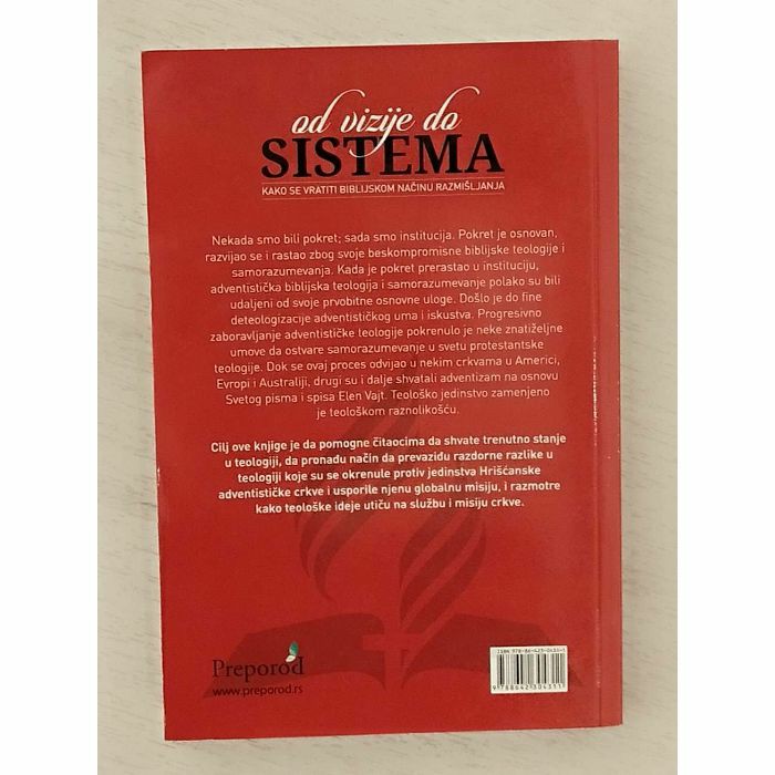 oa vizije do SISTEMA KAKO SE VRATITI BIBLIJSKOM NAČINU RAZMIŠLJANJA Nekada smo bili pokret; sada smo institucija. Pokret je osnovan, razvijao se i rastao zbog svoje beskompromisne biblijske teologije i samorazumevanja. Kada je pokret prerastao u instituciju, adventistička biblijska teologija i samorazumevanje polako su bili udaljeni od svoje prvobitne osnovne uloge. Došlo je do fine deteologizacije adventističkog uma i iskustva. Progresivno zaboravljanje adventističke teologije pokrenulo je neke znatiželjne umove da ostvare samorazumevanje u svetu protestantske teologije. Dok se ovaj proces odvijao u nekim crkvama u Americi, Evropi i Australiji, drugi su i dalje shvatali adventizam na osnovu Svetog pisma i spisa Elen Vajt. Teološko jedinstvo zamenjeno je teološkom raznolikošću. Cilj ove knjige je da pomogne čitaocima da shvate trenutno stanje u teologiji, da pronadu način da prevaziđu razdorne razlike u teologiji koje su se okrenule protiv jedinstva Hrišćanske adventističke crkve i usporile njenu globalnu misiju, i razmotre kako teološke ideje utiču na službu i misiju crkve.