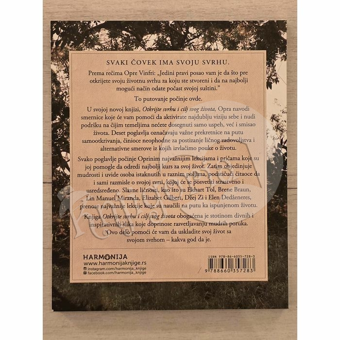 U svojoj novoj knjizi, Otkrijte svrhu i cilj svog života, Opra navodi smernice koje će vam pomoći da aktivirate najdublju viziju sebe i nudi podršku na čijim temeljima nećete dosegnuti samo uspeh, već i smisao života. Deset poglavlja označavaju važne prekretnice na putu samootkrivanja, činioce neophodne za postizanje ličnog zadovoljstva i alternativne smerove iz kojih izvlačimo pouke o životu.