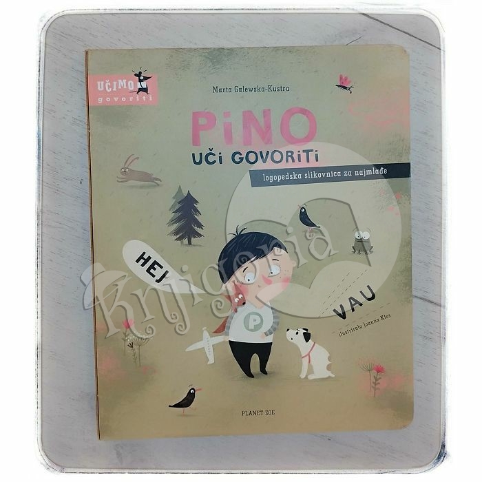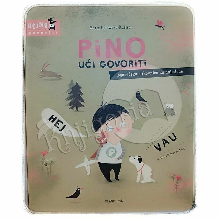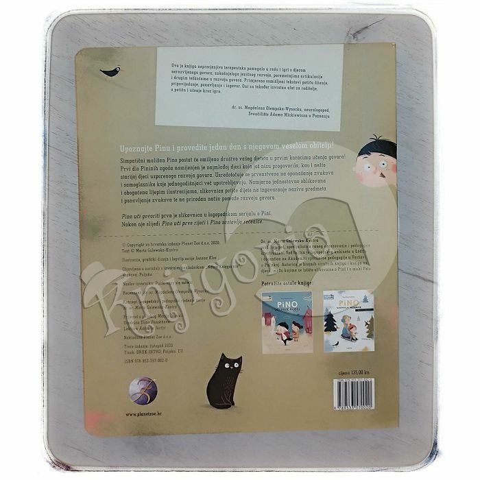 Pino je mali dječak koji živi u osebujnoj obitelji i svaki dan proživljava razne zgode. Prvi dio Pinovih zgoda namijenjen je najmlađoj djeci od 6 mjeseci kao i onima sa zakašnjelim razvojem govora. Usredotočuje se prvenstveno na oponašanje zvukova (onomatopeja) i na samoglasnike koje jednogodišnjaci već upotrebljavaju. Slikovnica ima tvrde korice, prikazuje najjednostavnije načine poticanja govora. U onomatopejskim zapisima na ilustracijama namjerno su ispušteni interpunkcijski znakovi kako bi dijete vizualno zapamtilo onomatopeju i na taj način lakše svladalo čitanje. Na dnu svake stranice posebno su još istaknuti pojmovi s jednostavnim pitanjima koji se odnose na ilustracije. Pino uči govoriti prva je slikovnica u logopedskom serijalu o Pini. Nakon nje slijedi Pino uči prve riječi.
