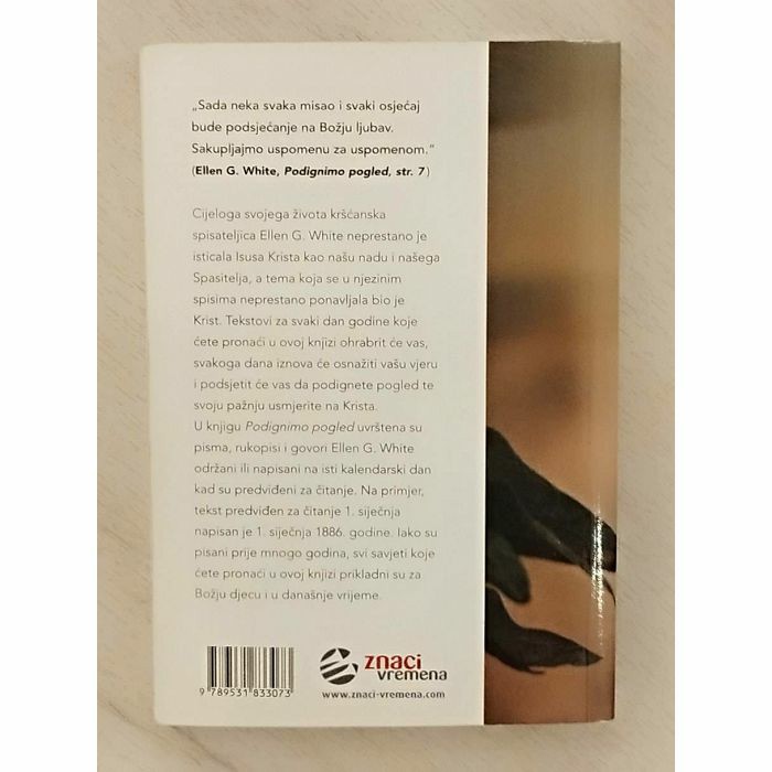Knjiga Podignimo pogled puna je prekrasnih tekstova koji će vam pomoći da prepoznate bogatstvo Kristove milosti. Njezini redci ohrabrit će vas, a misli koje ćete u njoj čitati umirit će vas, utješiti i osnažiti. Pronaći ćete radost u Bogu i Njegovim obećanjima. Ellen White, uvažena kršćanska spisateljica i autorica tekstova sabranih u knjizi Podignimo pogled, kaže: "Iz Božjih obećanja crpimo sav taj mir, tu utjehu i nadu koja će u nama razviti plodove mira, radosti i vjere. Unoseći ta obećanja u vlastiti život, mi ih uvijek unosimo i u život drugih. Prisvojimo onda ta obećanja za sebe. (...) Ona su kao dragocjeno cvijeće u Božjem vrtu. Ona trebaju probuditi našu nadu i iščekivanje, dovesti nas do čvrste vjere i pouzdanja u Boga. Ona nas trebaju osnažiti u nevolji i pružiti nam vrijedne pouke o povjerenju u Boga. On u tim dragocjenim obećanjima otkriva ono što je vječno..." (Podignimo pogled, str. 9, 10) Zato podignite pogled prema vječnim vrijednostima i Božjim divnim poukama za vas već danas! Neka vas vrijedne kršćanske misli iz knjige Podignimo pogled prate kroz cijelu 2019. godinu.