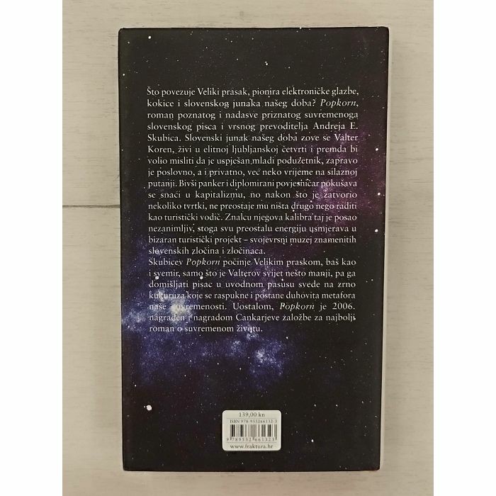 Što povezuje Veliki prasak, pionira elektroničke glazbe, kokice i slovenskog junaka našeg doba? Popkorn, roman poznatog i nadasve priznatog suvremenoga slovenskog pisca i vrsnog prevoditelja Andreja E. Skubica. Slovenski junak našeg doba zove se Valter Koren, živi u elitnoj ljubljanskoj četvrti i premda bi volio misliti da je uspješan mladi poduzetnik, zapravo je poslovno, a i privatno, već neko vrijeme na silaznoj putanji. Bivši panker i diplomirani povjesničar pokušava se snaći u kapitalizmu, no nakon što je zatvorio nekoliko tvrtki, ne preostaje mu ništa drugo nego raditi kao turistički vodič. Znalcu njegova kalibra taj je posao nezanimljiv, stoga svu preostalu energiju usmjerava u bizaran turistički projekt – svojevrsni muzej znamenitih slovenskih zločina i zločinaca.