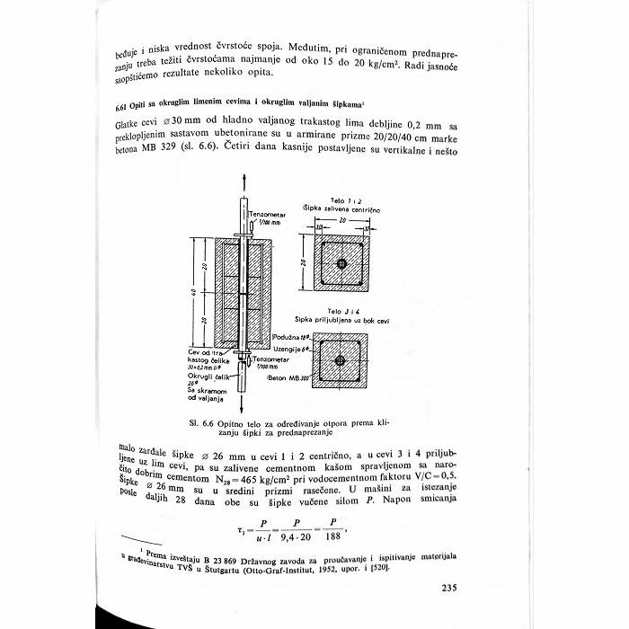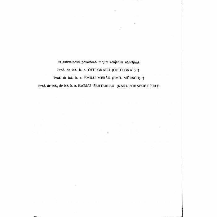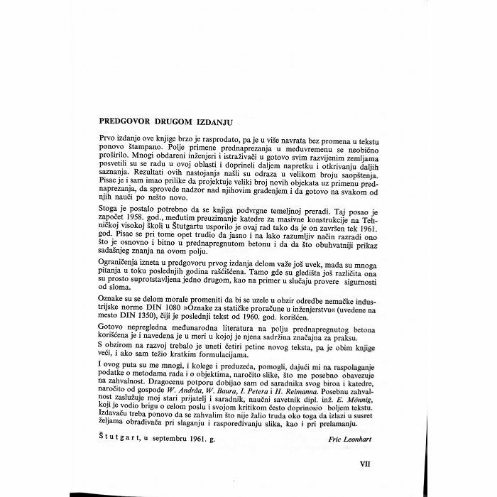 PREDGOVOR DRUGOM IZDANJU Prvo izdanje ove knjige brzo je rasprodato, pa je u više navrata bez promena u tekstu ponovo štampano. Polje primene prednaprezanja u međuvremenu se neobično proširilo. Mnogi obdareni inženjeri i istraživači u gotovo svim razvijenim zemljama posvetili su se radu u ovoj oblasti i doprineli daljem napretku i otkrivanju daljih saznanja. Rezultati ovih nastojanja našli su odraza u velikom broju saopštenja. Pisac je i sam imao prilike da projektuje veliki broj novih objekata uz primenu pred-naprezanja, da sprovede nadzor nad njihovim građenjem i da gotovo na svakom od njih nauči po nešto novo. Stoga je postalo potrebno da se knjiga podvrgne temeljnoj preradi. Taj posao je započet 1958. god., međutim preuzimanje katedre za masivne konstrukcije na Teh-ničkoj visokoj školi u Štutgartu usporilo je ovaj rad tako da je on završen tek 1961. god. Pisac se pri tome opet trudio da jasno i na lako razumljiv način razradi ono što je osnovno i bitno u prednapregnutom betonu i da da što obuhvatniji prikaz sadašnjeg znanja na ovom polju. Ograničenja izneta u predgovoru prvog izdanja delom važe još uvek, mada su mnoga pitanja u toku poslednjih godina rašćišćena. Tamo gde su gledišta još različita ona su prosto suprotstavljena jedno drugom, kao na primer u slučaju provere sigurnosti od sloma. Oznake su se delom morale promeniti da bi se uzele u obzir odredbe nemačke indus-trijske norme DIN 1080 >Oznake za statičke proračune u inženjerstvu<< (uvedene na mesto DIN 1350), čiji je poslednji tekst od 1960. god. korišćen. Gotovo nepregledna međunarodna literatura na polju prednapregnutog betona korišćena je i navedena je u meri u kojoj je njena sadržina značajna za praksu. S obzirom na razvoj trebalo je uneti četiri petine novog teksta, pa je obim knjige veći, i ako sam težio kratkim formulacijama. I ovog puta su me mnogi, i kolege i preduzeća, pomogli, dajući mi na raspolaganje podatke o metodama rada i o objektima, naročito slike, što me posebno obavezuje na zahvalnost. Dragocenu potporu dobijao sam od saradnika svog biroa i katedre, naročito od gospode W. Andräa, W. Baura, I. Petera i H. Reimanna. Posebnu zahval-nost zaslužuje moj stari prijatelj i saradnik, naučni savetnik dipl. inž. E. Mönnig, koji je vodio brigu o celom poslu i svojom kritikom često doprinosio boljem tekstu. Izdavaču treba ponovo da se zahvalim što nije žalio truda oko toga da izlazi u susret željama obrađivača pri slaganju i raspoređivanju slika, kao i pri prelamanju. Štutgart, u septembru 1961. g. Fric Leonhart