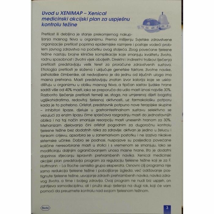 Pretilost ili debljina je stanje prekomjernog nakup-ljanja masnog tkiva u organizmu. Prema mišljenju Svjetske zdravstvene organizacije pretilost poprima epidemijske razmjere i postaje vodeći prob-lem javnog zdravstva na početku ovog stoljeća. Zbog povećane tjelesne težine nastaju brojne kliničke komplikacije koje smanjuju kvalitetu života, radnu sposobnost i životni vijek oboljelih. Direktni i indirektni troškovi liječenja pretilosti predstavljaju velik teret za proračune zdravstvenih sustava. Etiologija pretilosti je složena i uključuje genetske faktore, životne navike, psihološke čimbenike, ali nedvojbeno je da jednu od ključnih uloga ima masna prehrana. Masti predstavljaju znatan izvor kalorija koje se uskla-dištuju u organizmu u obliku masnog tkiva, a tipičan sastav ljudske hrane sadrži više od 40% masti, iako se preporuča da udio masti iznosi najviše 30%. Razborito liječenje pretilosti temelji se, stoga, na umjerenoj dijeti bogatoj ugljikohidratima, redovitoj tjelesnoj aktivnosti, uz farmakološku potporu kada je to potrebno. Orlistat, predstavnik potpuno nove terapijske skupine inhibitori lipaze, djeluje u gastrointestinalnom sustavu selektivno se vezujući za enzim lipazu čime sprječava razgradnju masti do jednostavnijih oblika i na taj način smanjuje resorpciju masti unesenih hranom za 30%. Mehanizam djelovanja čini orlistat pogodnim za dugoročnu kontrolu tjelesne težine bez dodatnih rizika za zdravlje: aktivan je jedino u želucu i tankom crijevu, apsorbira se u zanemarivom postotku i ne izaziva nikakve sistemske učinke. Dobro se podnosi, nuspojave su posljedica povećane količine neresorbirane masti u stolici i s vremenom se smanjuju, lako se modificiraju daljnjim ograničavanjem unosa masne hrane, što je dodatni doprinos stjecanju ispravnih prehrambenih navika. Xenical medicinski akcijski plan predstavlja program za regulaciju tjelesne težine koji je za F Hoffmann - La Roche osmislila grupa eksperata, Osnovni cilj programa nije samo redukcija tjelesne težine i poboljšanje izgleda, već održavanje pos-tignute tjelesne težine, usvajanje zdravih prehrambenih navika, navika zdra-vog života, a time i boljeg zdravija. Ovaj program ne nudi brz uspjeh, on zahtijeva sarnodisciplinu, ali i pruža skup rješenja na dugi rok, koji će vam pomoći da preuznete kontrolu nad svojom tjelesnom težinom. Roche