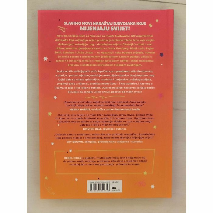 „Oduvijek sam željela da moje kćeri razmišljaju izvan okvira. Čitanje Priča za laku noć za mlade buntovnice naučilo ih je upravo tome. Upoznavši žene i djevojke koje se zalažu za svoja uvjerenja, dobile su uzor u koji se mogu ugledati i ideje o vlastitoj budućnosti.” KRISTEN BELL, glumica i autorica „Osjećala sam se nadahnuto nakon što sam pročitala ove priče o junakinjama koje pomiču granice i time pokazuju kako mlade djevojke mijenjaju svijet!” SKY BROWN, olimpijka, profesionalna skejterica i surferica