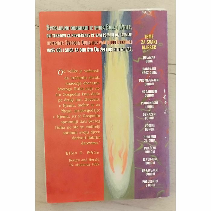 SPECIJALNO ODABRANI IZ SPISA ELLEN WHITE, OVI TEKSTOVI ZA POSVEĆENJE ĆE VAM POMOĆI DA JASNIJE UPOZNATE SVETOGA DUHA DOK VAM BUDU OYVAKALI VAŠE OČI I SRCA ZA ONO ŠTO ON ŽELI UČINITI ZA VAS. "Od velike je važnosti da kršćanin shvati značenje obećanja Svetoga Duha prije no što Gospodin Isus dode po drugi put. Govorite o Njemu, molite se za Njega, propovijedajte o Njemu: jer je Gospodin spremniji dati Svetog Duha no što su roditelji spremni svoju djecu darivati dobrim darovima."