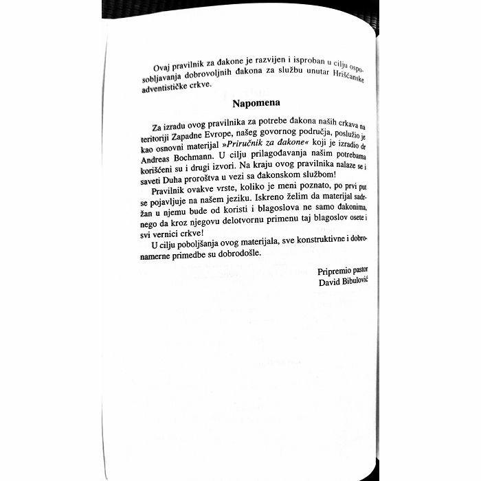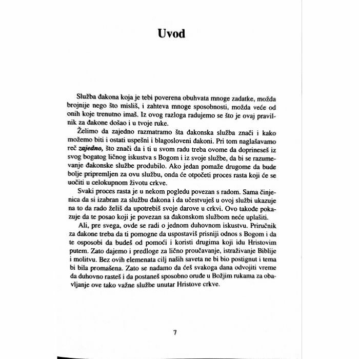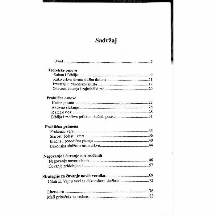 Sadržaj Uvod Teoretske osnove Đakon i Biblija Kako crkva shvata službu đakona.. Izveštaji u đakonskoj službi Obaveza ćutanja i zajednički rad Praktične osnove Kućne posete Aktivno slušanje Razgovor Biblija i molitva prilikom kućnih poseta.. Praktična primena Problemi vere Starost, bolest i smrt Bračna i porodična pitanja Đakonska služba u rastu crkve Negovanje i čuvanje novorođenih Negovanje novorođenih Čuvanje pridobijenih Strategije za čuvanje novih vernika Citati E. Vajt u vezi sa dakonskom službom Literatura Mali priručnik za redare