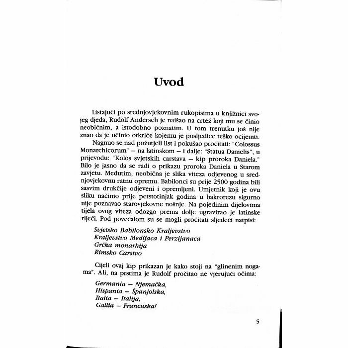 Uvod Listajući po srednjovjekovnim rukopisima u knjižnici svo-jeg djeda, Rudolf Andersch je naišao na crtež koji mu se činio neobičnim, a istodobno poznatim. U tom trenutku još nije znao da je učinio otkriće kojemu je posljedice teško ocijeniti. Nagnuo se nad požutjeli list i pokušao pročitati: "Colossus Monarchicorum" na latinskom i dalje: "Statua Danielis", u prijevodu: "Kolos svjetskih carstava kip proroka Daniela." Bilo je jasno da se radi o prikazu proroka Daniela u Starom zavjetu. Međutim, neobična je slika viteza odjevenog u sred-njovjekovnu ratnu opremu. Babilonci su prije 2500 godina bili sasvim drukčije odjeveni i opremljeni. Umjetnik koji je ovu sliku načinio prije petstotinjak godina u bakrorezu sigurno nije poznavao starovjekovne nošnje. Na pojedinim dijelovima tijela ovog viteza odozgo prema dolje ugravirao je latinske riječi. Pod povećalom su se mogli pročitati sljedeći natpisi: Svjetsko Babilonsko Kraljevstvo Kraljevstvo Medijaca i Perzijanaca Grčka monarhija Rimsko Carstvo...