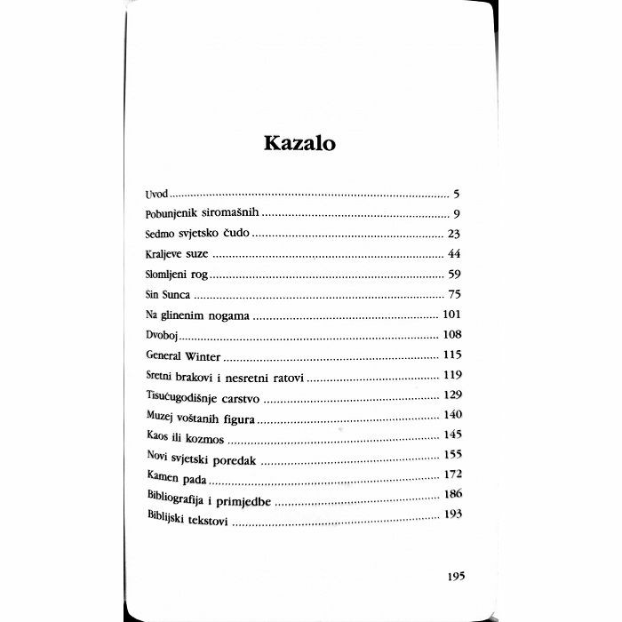Kazalo Uvod Pobunjenik siromašnih Sedmo svjetsko čudo Kraljeve suze Slomljeni rog Sin Sunca Na glinenim nogama Dvoboj General Winter Sretni brakovi i nesretni ratovi Tisućugodišnje carstvo Muzej voštanih figura Kaos ili kozmos Novi svjetski poredak Kamen pada. Bibliografija i primjedbe Biblijski tekstovi