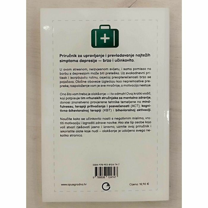 Priručnik za upravljanje i prevladavanje najtežih simptoma depresije — brzo i učinkovito. U ovom stresnom, neizvjesnom svijetu, i sama pomisao na borbu s depresijom može biti preteška. Uz svakodnevni pritisak i iscrpljujuću rutinu, osjećaj preopterećenosti brzo se pojačava. Obične obaveze izgledaju kao nepremostive prepreke, raspoloženje vam je sve mračnije, a motivacija nestaje. Ono što vam treba je olakšanje — i to odmah! Ovaj kratki vodič, koji potpisuje tim vrhunskih stručnjaka za mentalno zdravlje, donosi znanstveno provjerene tehnike temeljene na mindfulnessu, terapiji prihvaćanja i posvećenosti (ACT), kognitivno- bihevioralnoj terapiji (KBT) i bihevioralnoj aktivaciji. Naučite kako se učinkovito nositi s negativnim mislima, vratiti motivaciju i izgraditi zdrave navike. Ako ste tip osobe koja voli stvari rješavati jasno i izravno, uzmite ovaj priručnik i iskoristite alate koje nudi – olakšanje je udaljeno svega nekoliko stranica.