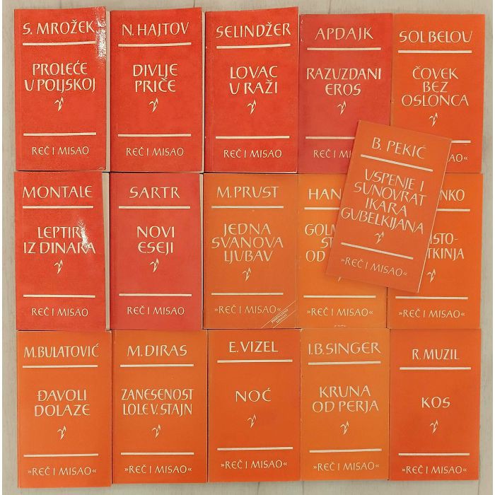 S. MROŽEK: PROLJEĆE U POLJSKOJ N. HAJTOV: DIVLJE PRIČE J. D. SALINGER: LOVAC U ŽITU J. APDIKE: RAZUZDANI EROS S. BELLOW: ČOVJEK BEZ OSLONCA E. MONTALE: LEPTIR IZ DINARA J. P. SARTRE: NOVI ESEJI M. PROUST: JEDNA SWANNOVA LJUBAV B. PEKIĆ: USPENJE I SUNOVRAT IKARA GUBELKIJANA M. BULATOVIĆ: ĐAVOLI DOLAZE M. DURAS: ZANESENOST LOLE V. STAJN E. WIESEL: NOĆ I. B. SINGER: KRUNA OD PERJA R. MUZIL: KOS