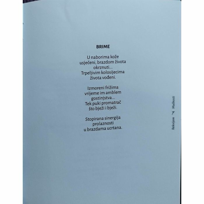 BRIME U naborima kože usječeni, brazdom života okrznuti... Trpeljivim kolosijecima života vođeni. Izmoreni frižima vrijeme im amblem gostinjstva... Tek puki promatrač što bježi i bježi. Stopirana sinergija prolaznosti u brazdama ucrtana. Rekvijem Muškosti
