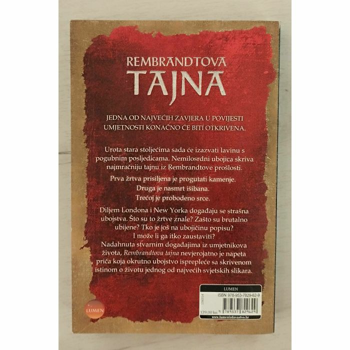 Napeti povijesni triler prepun preokreta i ubuđenja, o zavjeri u umjetničkom svijetu, o brojim intrigama, tajnama i lažima koje otkrivaju potresnu istinu o jednome od najvećih slikara svih vremena. Urota stara stoljećima sada će izazvati lavinu s pogubnim posljedicama. Nemilosrdni ubojica skriva najmračniju tajnu iz Rembrandtove prošlosti. Prva žrtva prisiljena je progutati kamenje. Druga je nasmrt išibana. Trećoj je probodeno srce. Diljem Londona i NewYorka događaju se strašna ubojstva. Što su to žrtve znale? Zašto su brutalno ubijene? Tko je još na ubojičinu popisu? I može li ga itko zaustaviti? Nadahnuta stvarnim događajima iz umjetnikova života, Rembrandtova tajna nevjerojatno jenapeta priča koja okrutno ubojstvo isprepleće sa skrivenom istinom o životu jednog od najvećih svjetskih slikara.