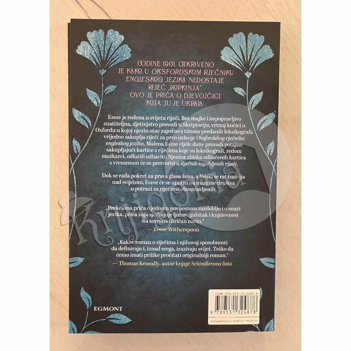 Godine 1901. otkriveno je kako u Oksfordskom rječniku engleskog jezika nedostaje riječ „ropkinja“. Ovo je priča o djevojčici koja ju je ukrala. Esme je ro¬đena u svijetu riječi. Bez majke i nepopravljivo znatiželjna, djetinjstvo provodi u Skriptoriju, vrtnoj kućici u Oxfordu u kojoj njezin otac zajedno s timom predanih leksikografa vrijedno sakuplja riječi za prvo izdanje Oksfordskog rječnika engleskog jezika. Malena Esme cijele dane provodi potajno sakupljajući kartice s riječima koje su leksikografi, redom muškarci, odlučili odbaciti. Njezina zbirka odbačenih kartica s vremenom će se pretvoriti u Rječnik izgubljenih riječi. Dok se rađa pokret za prava glasa žena, a Veliki se rat nadvija nad svijetom, Esme će se uputiti na margine društva u potrazi za riječima obespravljenih. „Prekrasna priča o velikim povijesnim previranjima i o snazi jezika, priča koja sjedinjuje ljubav, gubitak i književnost na savršeno liričan način.“ — Reese Witherspoon „Kakav roman o riječima i njihovoj sposobnosti da definiraju i, iznad svega, izazivaju svijet. Teško da ćemo imati prilike pročitati originalniji roman.“ — Thomas Keneally, autor knjige Schindlerova lista