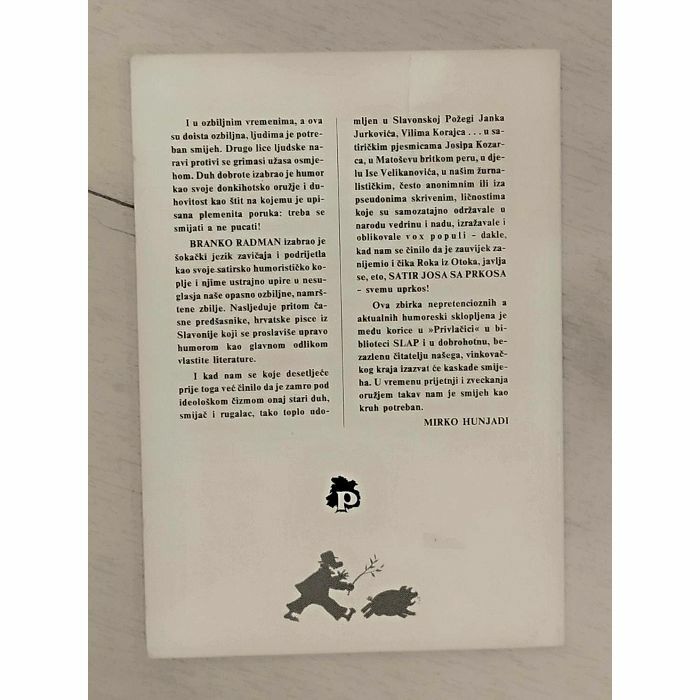 I u ozbiljnim vremenima, a ova su doista ozbiljna, ljudima je potre-ban smijeh. Drugo lice ljudske na-ravi protivi se grimasi užasa osmje-hom. Duh dobrote izabrao je humor kao svoje donkihotsko oružje i du-hovitost kao štit na kojemu je upi-sana plemenita poruka: treba se smijati a ne pucati! BRANKO RADMAN izabrao je šokački jezik zavičaja i podrijetla kao svoje satirsko humorističko ko-plje i njime ustrajno upire u nesu-glasja naše opasno ozbiljne, namrš-tene zbilje. Nasljeduje pritom ča-sne predšasnike, hrvatske pisce iz Slavonije koji se proslaviše upravo humorom kao glavnom odlikom vlastite literature.