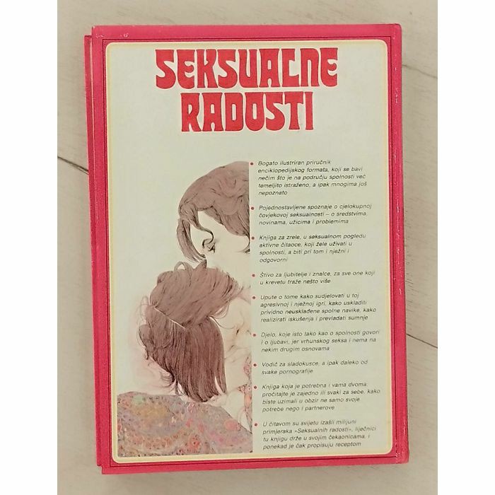 Bogato ilustriran priručnik enciklopedijskog formata, koji se bavi nečim što je na području spolnosti već temeljito istraženo, a ipak mnogima još nepoznato Pojednostavljene spoznaje o cjelokupnoj čovjekovoj seksualnosti o sredstvima novinama, užicima problemima Knjiga za zrele, u seksualnom pogledu aktivne čitaoce, koji žele uživati u spolnosti, a biti pri tom i nježni odgovorni Štivo za ljubitelje i znalce, za sve one koji u krevetu traže nešto više Upute o tome kako sudjelovati u toj agresivnoj i nježnoj igri kako uskladiti prividno neuskladene spolne navike, kako realizirati iskušenja i prevladati sumnje Djelo, koje isto tako kao o spolnosti govori I o ljubavi, jer vrhunskog seksa i nema na nekim drugim osnovama Vodič za sladokusce a ipak daleko od svake pornografije Knjiga koja je potrebna i vama dvoma pročitajte je zajedno ili svaki za sebe, kako biste uzimali u obzir ne samo svoje potrebe nego partnerove U čitavom su svijetu izašli milijuni primjeraka Seksualnih radosti, liječnici tu knjigu drže u svojim čekaonicama ponekad je čak propisuju receptom