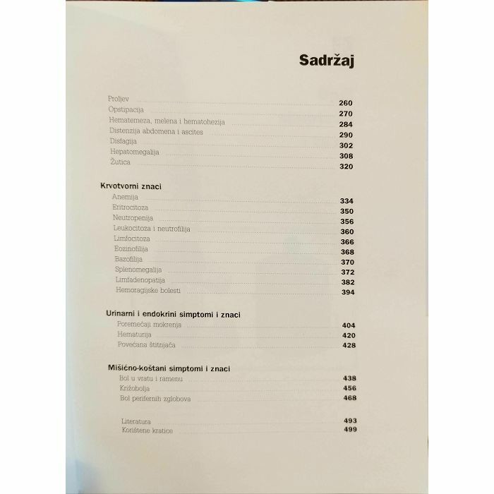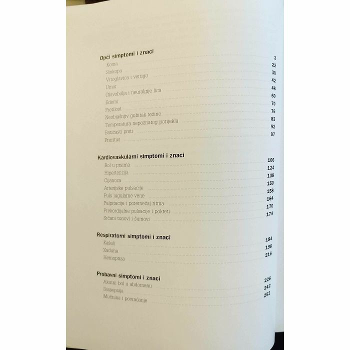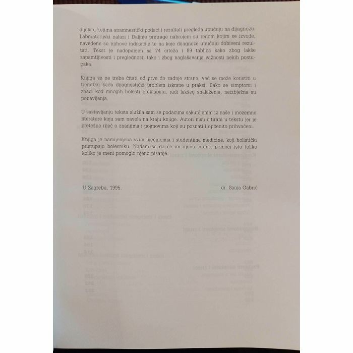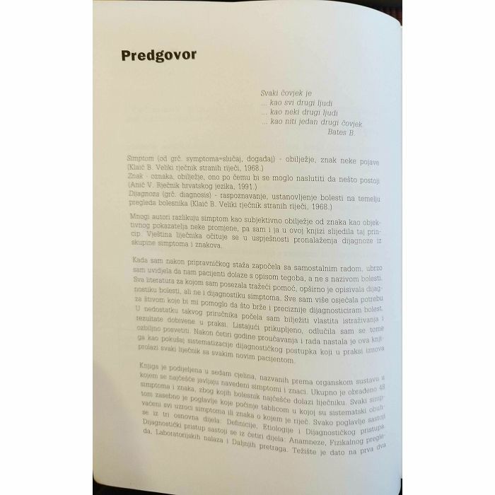 Svaki čovjek je kao svi drugi ljudi... kao neki drugi ljudi kao niti jedan drugi čovjek Bates B Simptom (od gre. symptoma slučaj, dogadaj) obilježje, znak neke pojave (Klaić B. Veliki rječnik stranih riječi, 1968.) Znak oznaka, obilježje, ono po čemu bi se moglo naslutiti da nešto postoji (Anić V. Rječnik hrvatskog jezika, 1991.) Dijagnoza (grč. diagnosis) raspoznavanje, ustanovljenje bolesti na temelju pregleda bolesnika (Klaić B. Veliki rječnik stranih riječi, 1968.) Mnogi autoti razlikuju simptom kao subjektivno obilježje od znaka kao objek tivnog pokazatelja neke promjene, pa sam i ja u ovoj knjizi slijedila taj prin cip. Vještina liječnika očituje se u uspješnosti pronalaženja dijagnoze iz skupine simptoma i znakova. Kada sam nakon pripravničkog staža započela sa samostalnim radom, ubrzo sam uvidjela da nam pacijenti dolaze s opisom tegoba, a ne s nazivom bolesti. Sva literatura za kojom sam posezala tražeći pomoć, opširno je opisivala dijag nostiku bolesti, ali ne i dijagnostiku simptoma. Sve sam više osjećala potrebu za štivom koje bi mi pomoglo da što brže i preciznije dijagnosticiram bolest U nedostatku takvog priručnika počela sam bilježiti vlastita istraživanja rezultate dobivene u praksi. Listajući prikupljeno, odlučila sam se tome ozbiljno posvetiti. Nakon četiri godine proučavanja i rada nastala je ova kn Da kao pokušaj sistematizacije dijagnostičkog postupka koji u praksi iznova prolazi svaki liječnik sa svakim novim pacijentom. Knjiga je podijeljena u sedam cjelina, nazvanih prema organskom sustavu u kojem se najčešće javljaju navedeni simptomi i znaci. Ukupno je obradeno 48 simptome / znaka, zbog kojih bolesnik najčešće dolazi liječniku. Svaki sump tom zasebno je poglavlje koje počinje tablicom u kojoj su sistematski obun vaćeni svi uzroci simptoma ili znaka o kojem je riječ. Svako poglavlje sastop se iz tri osnovna chela Definicije, Etiologije i Dijagnostičkog pristupa Dijagnosticki pristup sastoji se iz četiri dijela: Anamneze, Fizikalnog pregle da, Laboratorijskih nalaza | Daljnjih pretraga Težište je dato na prva dva Predgovor Svaki čovjek je kao svi drugi ljudi ... kao neki drugi ljudi kao niti jedan drugi čovjek Bates B Simptom (od gre. symptoma slučaj, dogadaj) obilježje, znak neke pojave (Klaić B. Veliki rječnik stranih riječi, 1968.) Znak oznaka, obilježje, ono po čemu bi se moglo naslutiti da nešto postoji (Anić V. Rječnik hrvatskog jezika, 1991.) Dijagnoza (grč. diagnosis) raspoznavanje, ustanovljenje bolesti na temelju pregleda bolesnika (Klaić B. Veliki rječnik stranih riječi, 1968.) Mnogi autoti razlikuju simptom kao subjektivno obilježje od znaka kao objek tivnog pokazatelja neke promjene, pa sam i ja u ovoj knjizi slijedila taj prin cip. Vještina liječnika očituje se u uspješnosti pronalaženja dijagnoze iz skupine simptoma i znakova. Kada sam nakon pripravničkog staža započela sa samostalnim radom, ubrzo sam uvidjela da nam pacijenti dolaze s opisom tegoba, a ne s nazivom bolesti. Sva literatura za kojom sam posezala tražeći pomoć, opširno je opisivala dijag nostiku bolesti, ali ne i dijagnostiku simptoma. Sve sam više osjećala potrebu za štivom koje bi mi pomoglo da što brže i preciznije dijagnosticiram bolest U nedostatku takvog priručnika počela sam bilježiti vlastita istraživanja rezultate dobivene u praksi. Listajući prikupljeno, odlučila sam se tome ozbiljno posvetiti. Nakon četiri godine proučavanja i rada nastala je ova kn Da kao pokušaj sistematizacije dijagnostičkog postupka koji u praksi iznova prolazi svaki liječnik sa svakim novim pacijentom. Knjiga je podijeljena u sedam cjelina, nazvanih prema organskom sustavu u kojem se najčešće javljaju navedeni simptomi i znaci. Ukupno je obradeno 48 simptome / znaka, zbog kojih bolesnik najčešće dolazi liječniku. Svaki sump tom zasebno je poglavlje koje počinje tablicom u kojoj su sistematski obun vaćeni svi uzroci simptoma ili znaka o kojem je riječ. Svako poglavlje sastop se iz tri osnovna chela Definicije, Etiologije i Dijagnostičkog pristupa Dijagnosticki pristup sastoji se iz četiri dijela: Anamneze, Fizikalnog pregle da, Laboratorijskih nalaza | Daljnjih pretraga Težište je dato na prva dva dijela u kojima anamnestički podaci i rezultati pregleda upućuju na dijagnozu Laboratorijski nalazi i Daljnje pretrage nabrojeni su redom kojim se izvode, navedene su njihove indikacije te na koje dijagnoze upućuju dobiveni rezul tati. Tekst je nadopunjen sa 74 crteža 1 89 tablica kako zbog lakše zapamtijivosti i preglednosti tako i zbog naglašavanja važnosti nekih postu paka Knjiga se ne treba čitati od prve do zadnje strane, već se može koristiti u trenutku kada dijagnostički problem iskrsne u praksi. Kako se simptomi i znaci kod mnogih bolesti preklapaju, radi lakšeg snalaženja, neizbježna su ponavljanja. U sastavljanju teksta služila sam se podacima sakupljenim iz naše i inozemne literature koju sam navela na kraju knjige. Auton nisu citirani u tekstu jer je pretežno riječ o znanjima i pojmovima koji su poznati i općenito prihvaćeni Knjiga je namijenjena svim liječnicima i studentima medicine, koji holistički pristupaju bolesniku. Nadam se da će im njeno čitanje pomoći isto toliko koliko je meni pomoglo njeno pisanje.