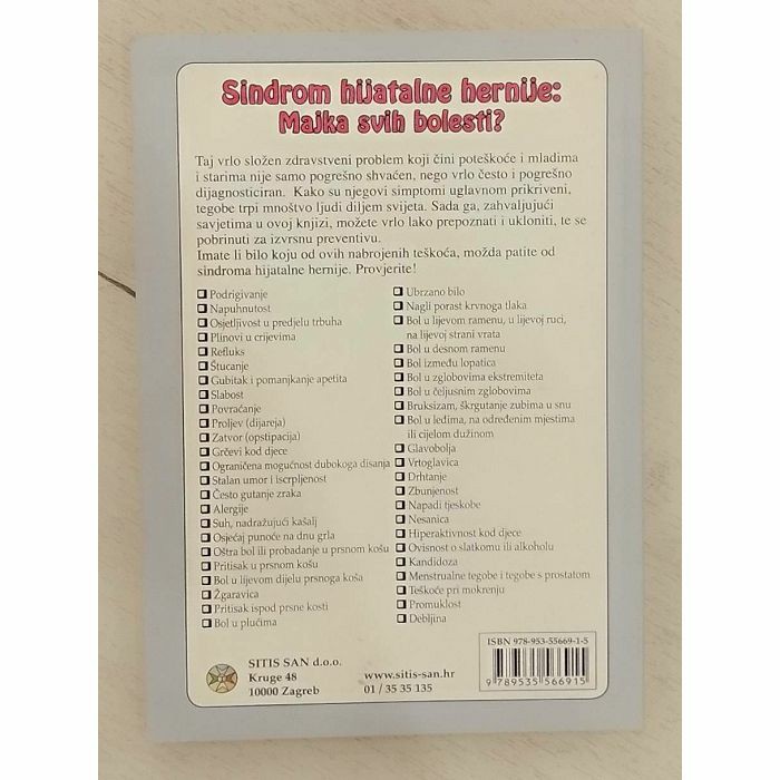 Hijatalna hernija je vrlo složen zdravstveni problem koji čini poteškoće i mladima i starima te nije samo pogrešno shvaćen, nego vrlo često i pogrešno dijagnosticiran. Kako su njegovi simptomi uglavnom prikriveni, tegobe trpi mnoštvo ljudi diljem svijeta. Sada ga, zahvaljujući savjetima u ovoj knjizi, možete vrlo lako prepoznati i ukloniti, te se pobrinuti za izvrsnu preventivu.